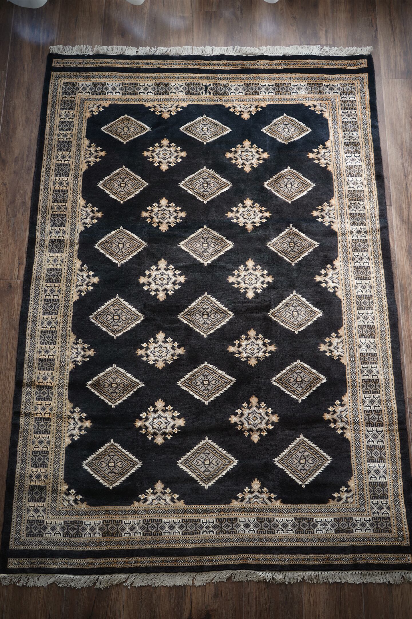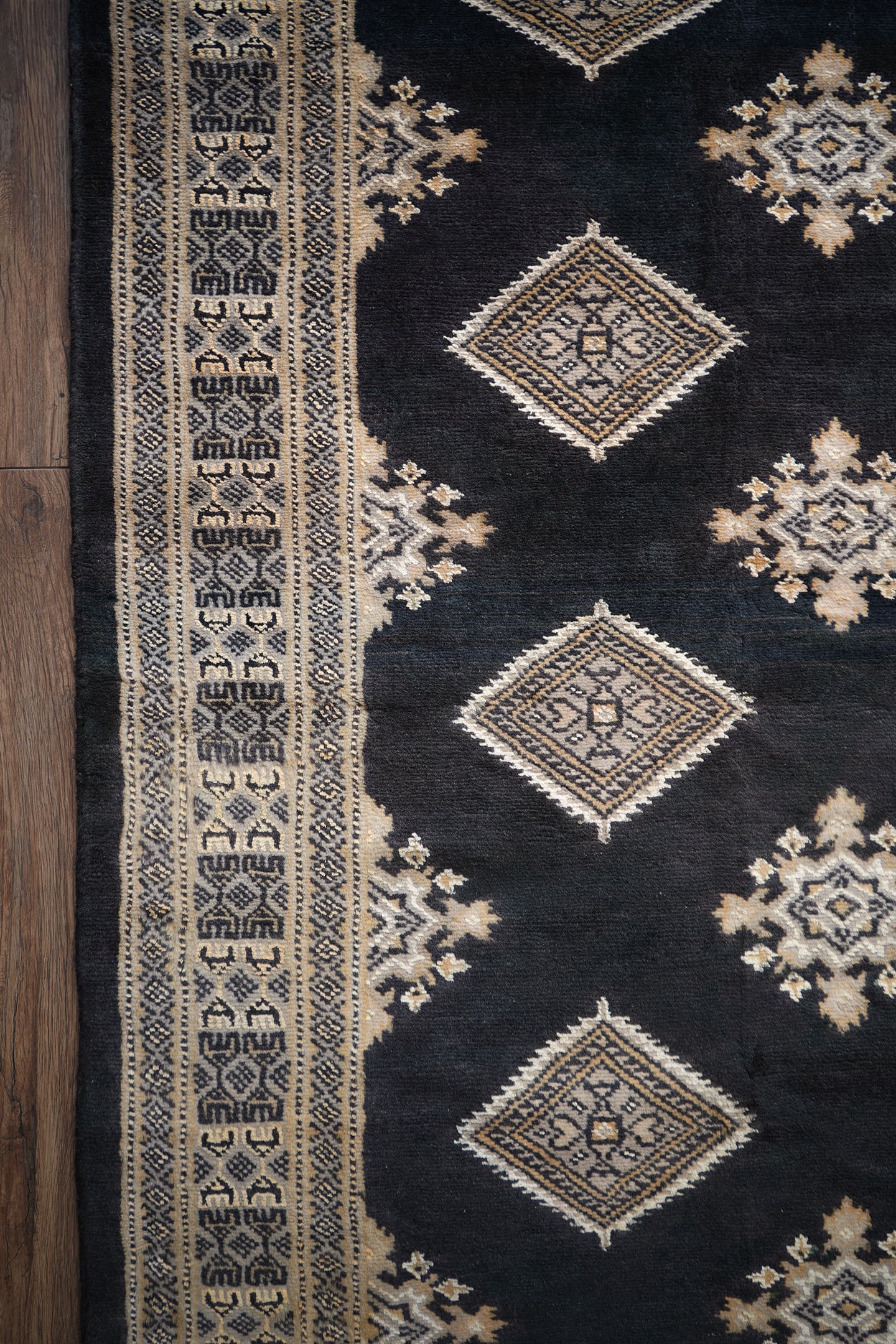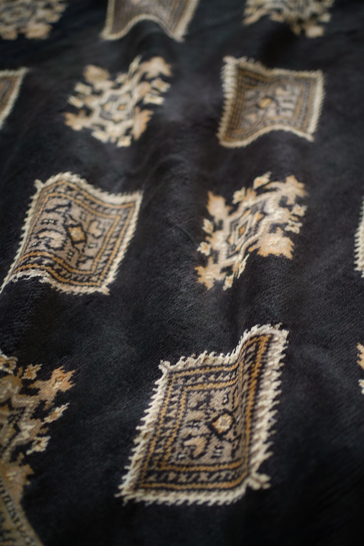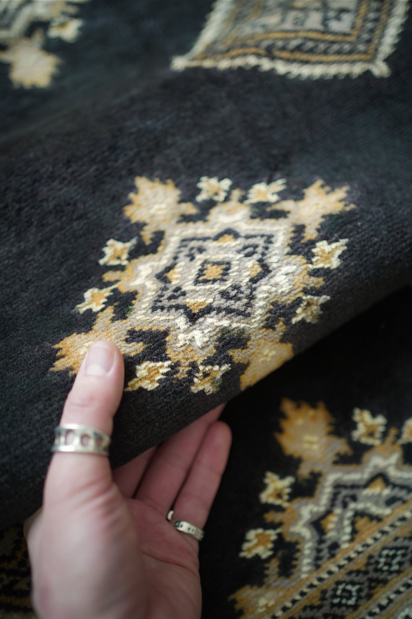 パキスタン北東部の都市ラホールで織られたヴィンテージラグ。パキスタンラグ特有の幾何学模様が織り込まれたデザインで、光沢感のある艶が美しい一枚。パキスタンラグでは珍しい黒色ベースの配色で、その他クリーム色、ベージュ、薄い黄土色などが使われたシックでカッコいい雰囲気です。ふわっと柔らかく、優しいタッチの心地良い肌触りで、厚みは9mm程度。統一感のあるフラットな毛並みで非常に上質感があります。ダメージも見受けられずパーフェクトなコンディション。リビングのソファ前やベッドサイドサイド、テーブル下にもオススメです。