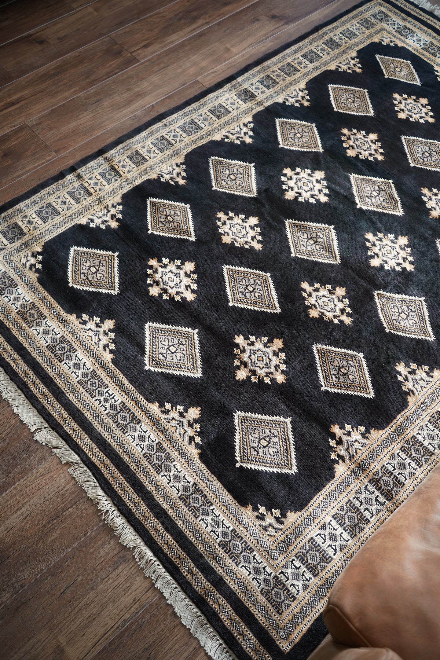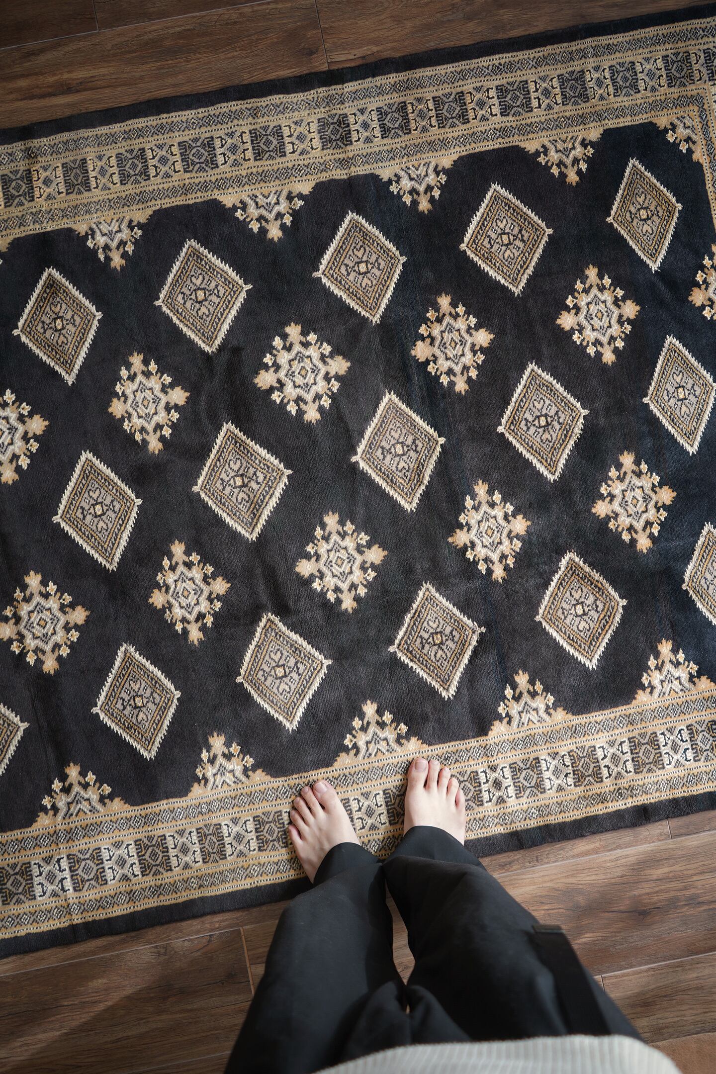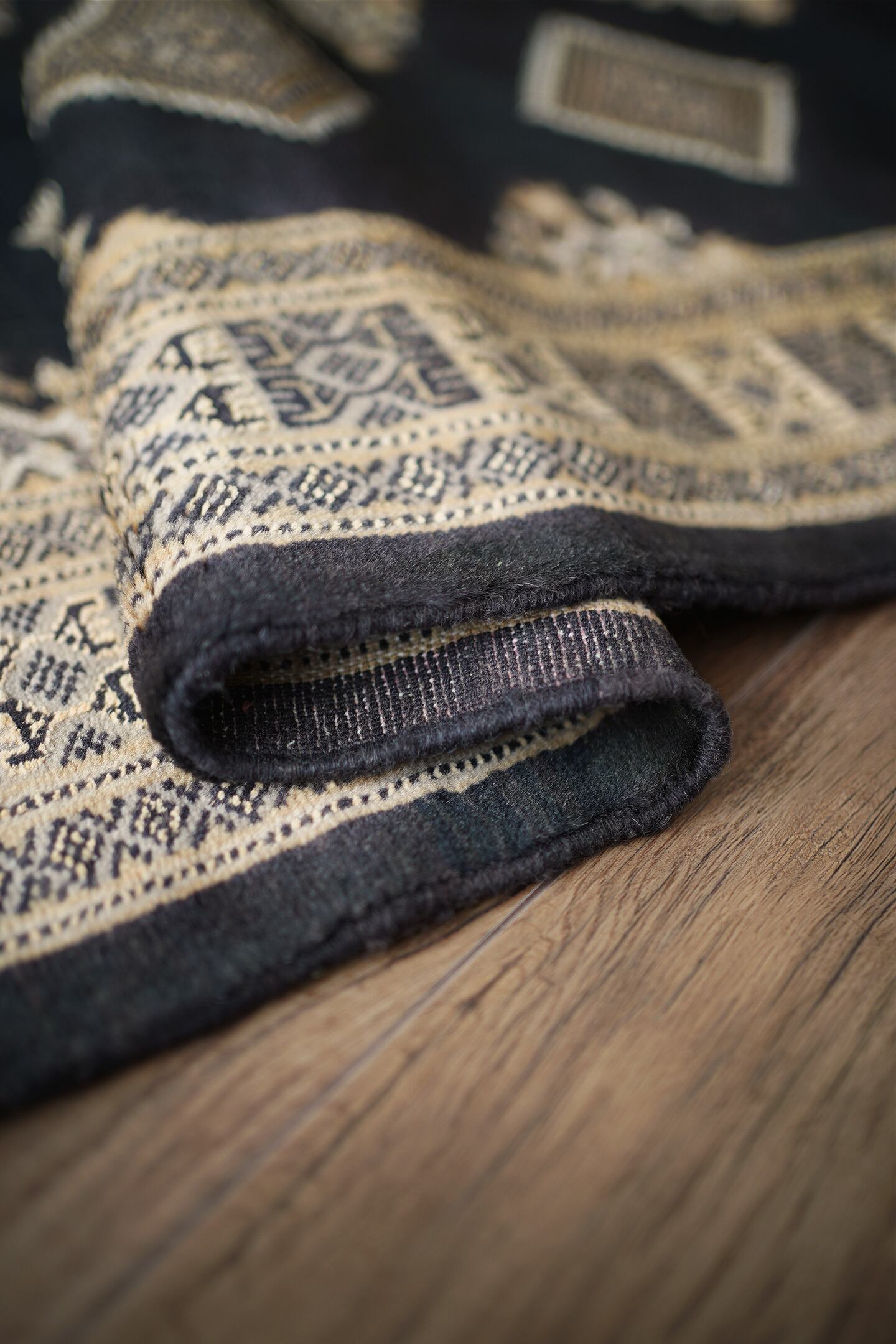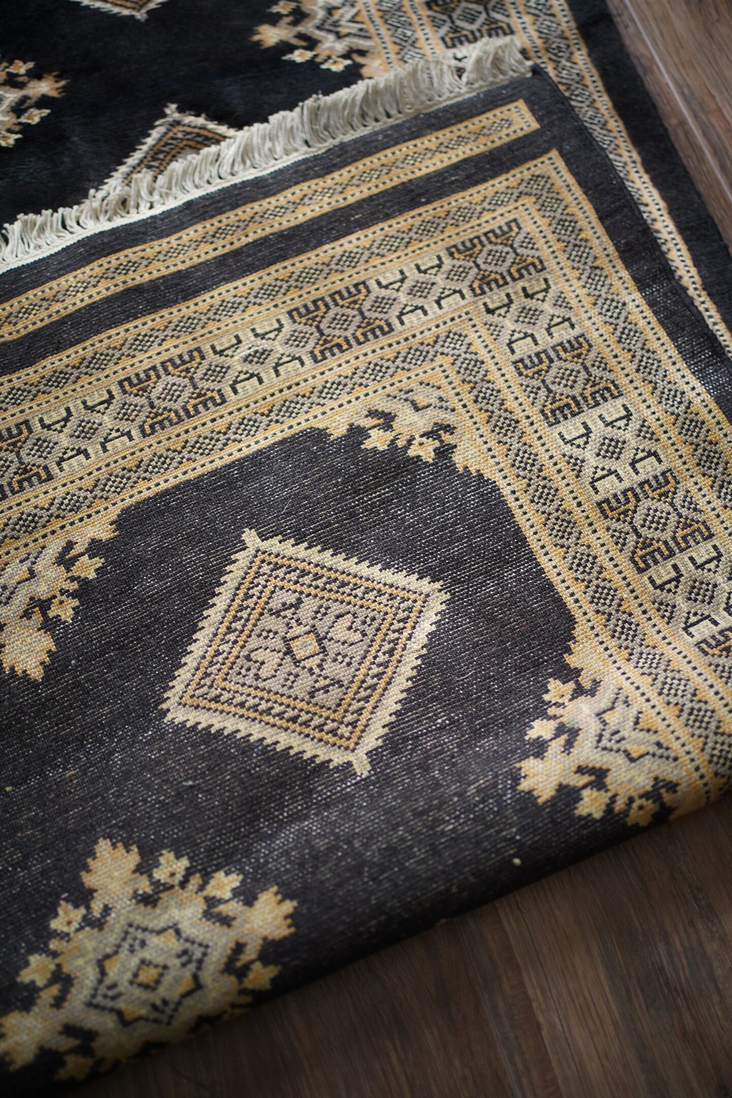 パキスタン北東部の都市ラホールで織られたヴィンテージラグ。パキスタンラグ特有の幾何学模様が織り込まれたデザインで、光沢感のある艶が美しい一枚。パキスタンラグでは珍しい黒色ベースの配色で、その他クリーム色、ベージュ、薄い黄土色などが使われたシックでカッコいい雰囲気です。ふわっと柔らかく、優しいタッチの心地良い肌触りで、厚みは9mm程度。統一感のあるフラットな毛並みで非常に上質感があります。ダメージも見受けられずパーフェクトなコンディション。リビングのソファ前やベッドサイドサイド、テーブル下にもオススメです。
