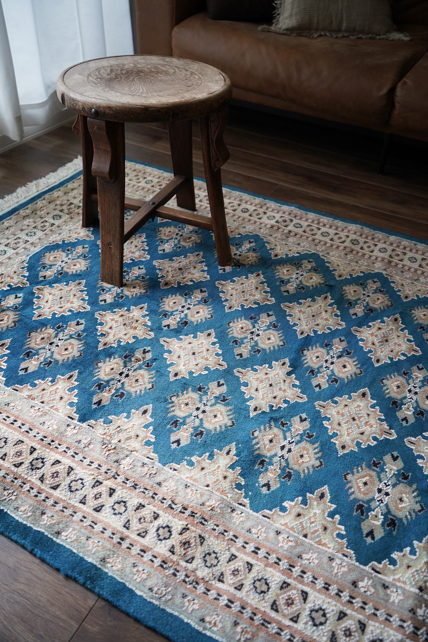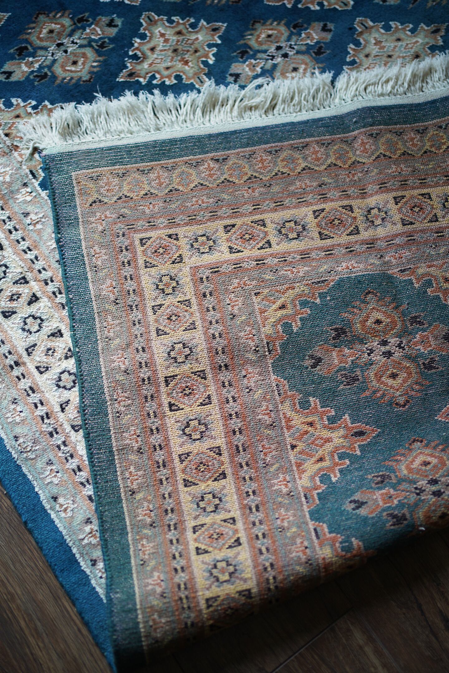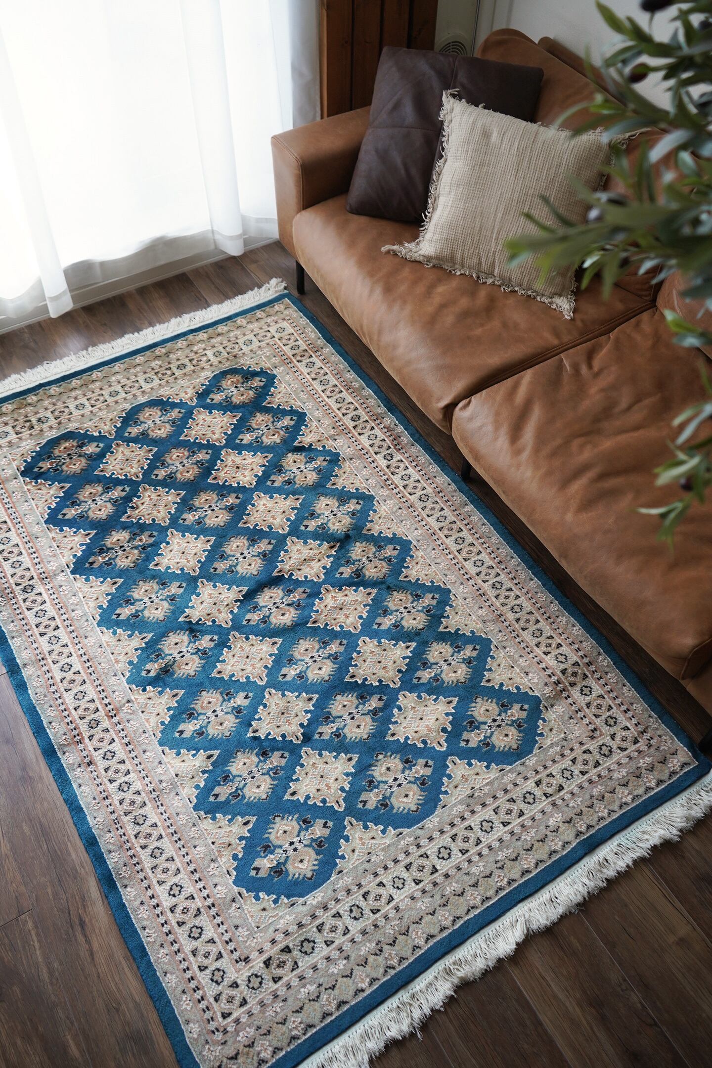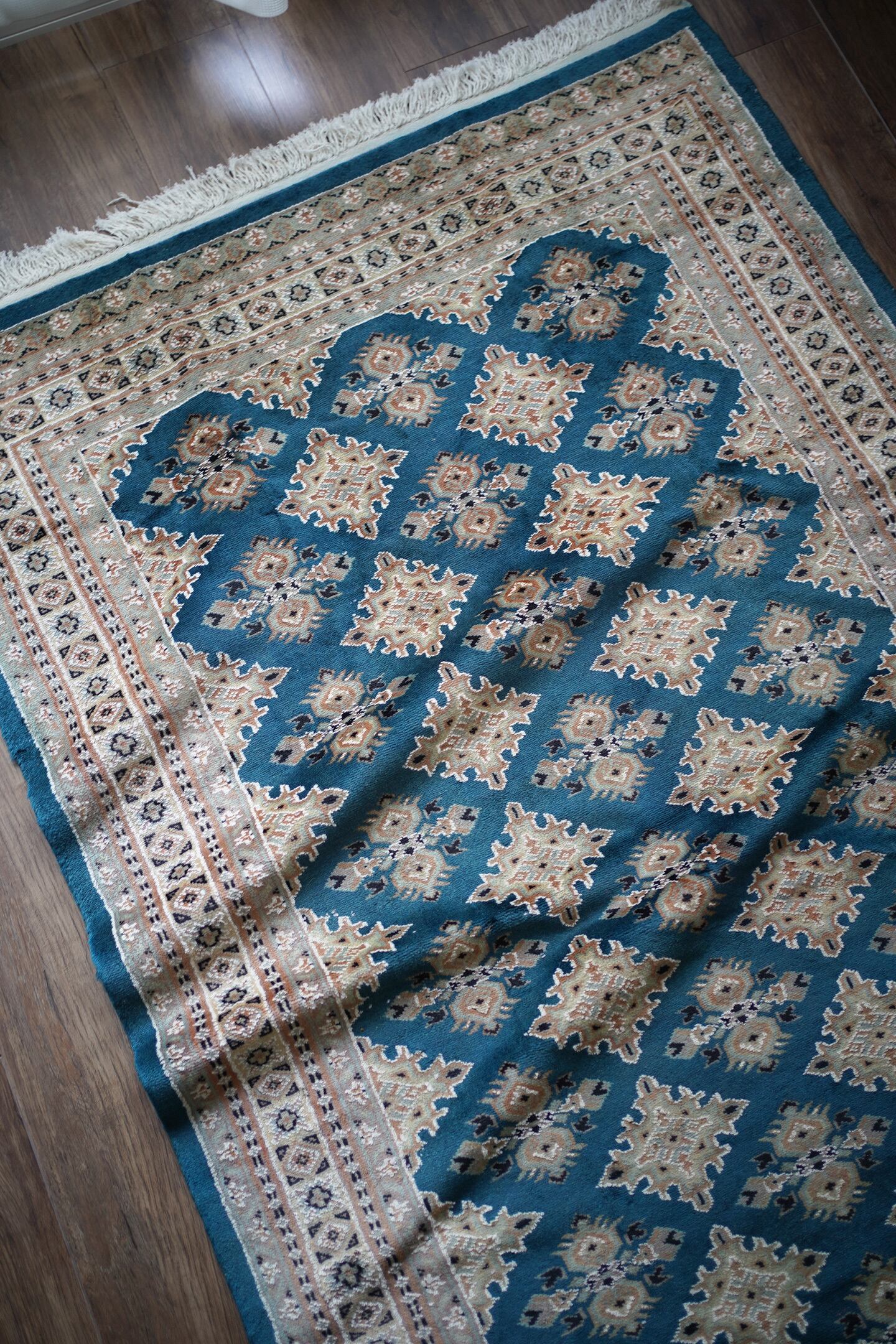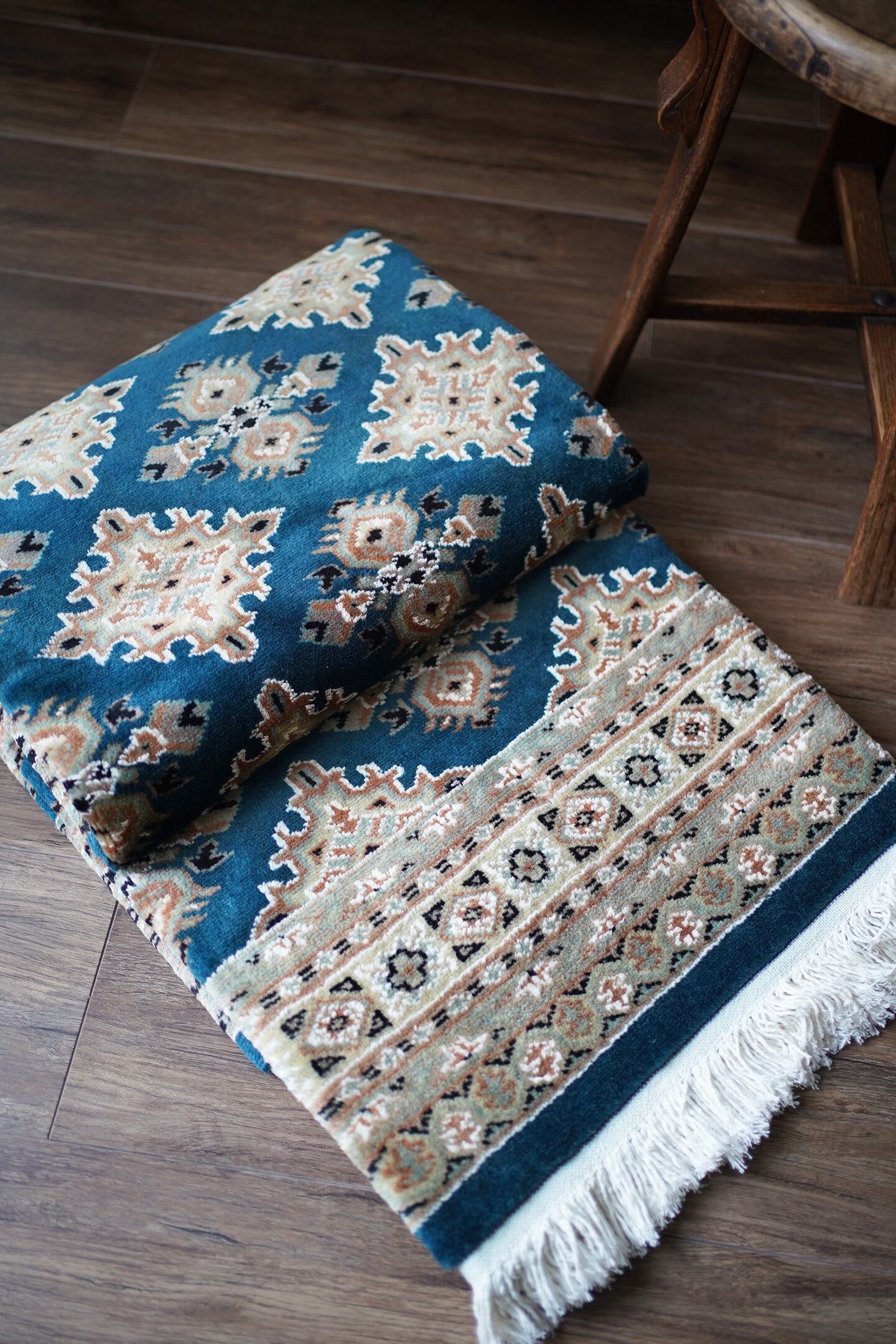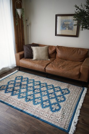見ているだけでうっとりしてしまうほど鮮やかで美しいターコイズブルーのパキスタンラグ。ターコイズブルーにあわせて使われた肌色・くすんだ水色・濃紺の組み合わせも素晴らしいセンスを感じさせます。表面はふわっと滑らかな気持ちの良い肌触りで、厚みは8mm程度。パイル全体には光沢感のある艶が広がり、統一感のあるフラットな毛並みで大変上質感があります。ダメージも見受けられずパーフェクトなコンディション。お迎えいただいた方はこのラグを広げた時にきっとこの美しさに驚かれると思いますよ♪
