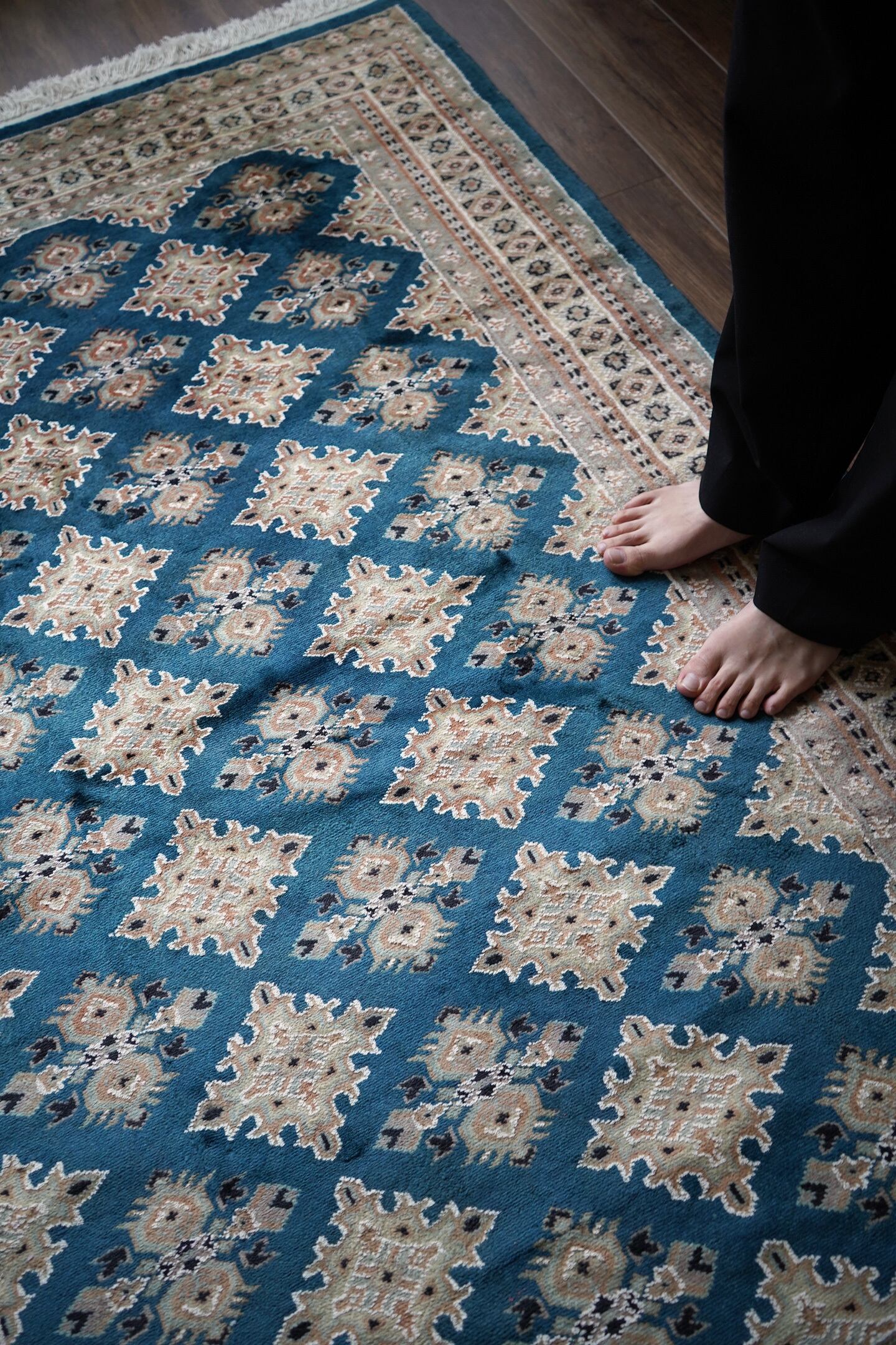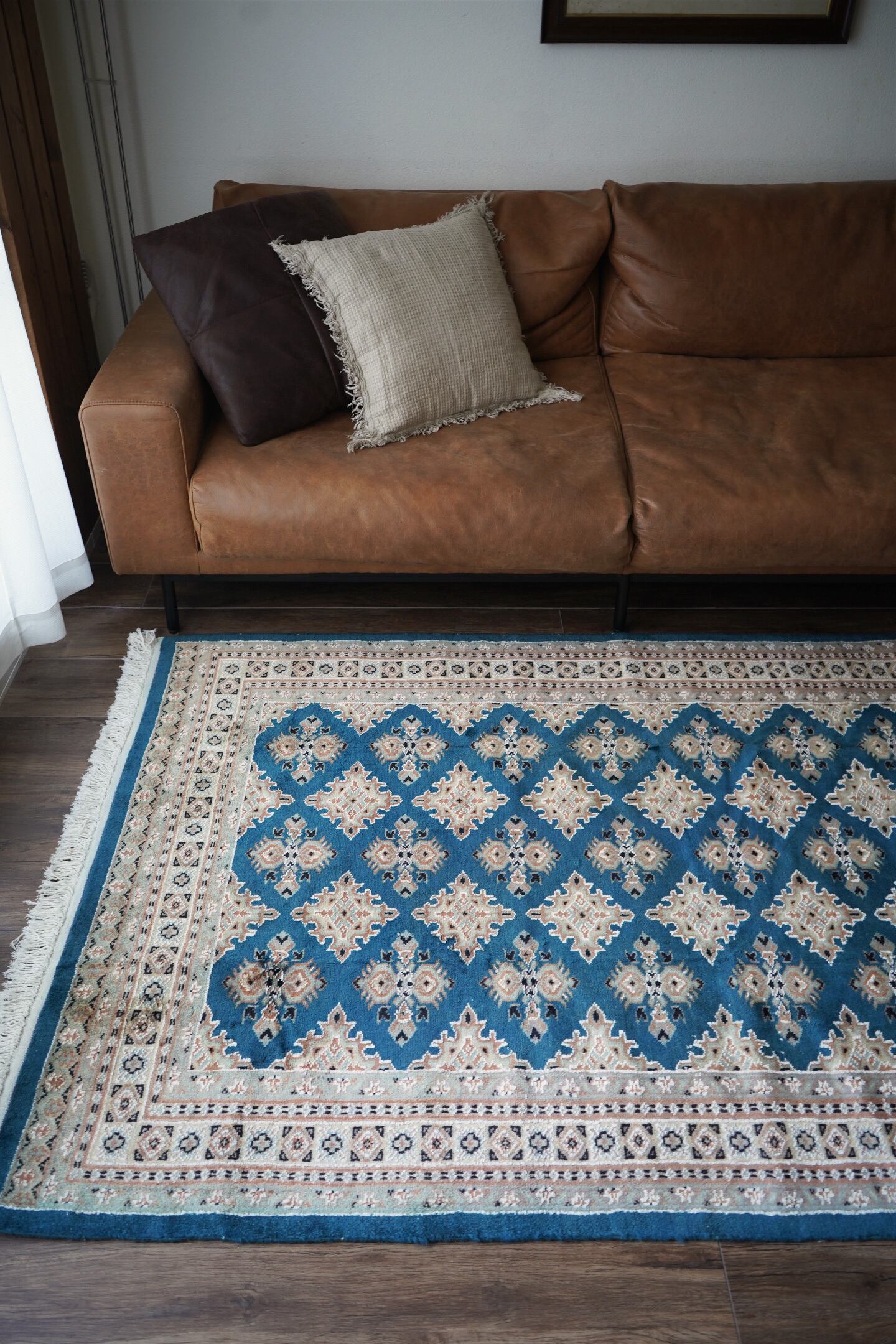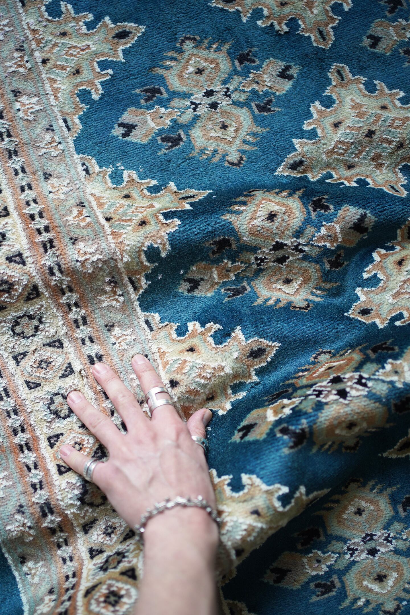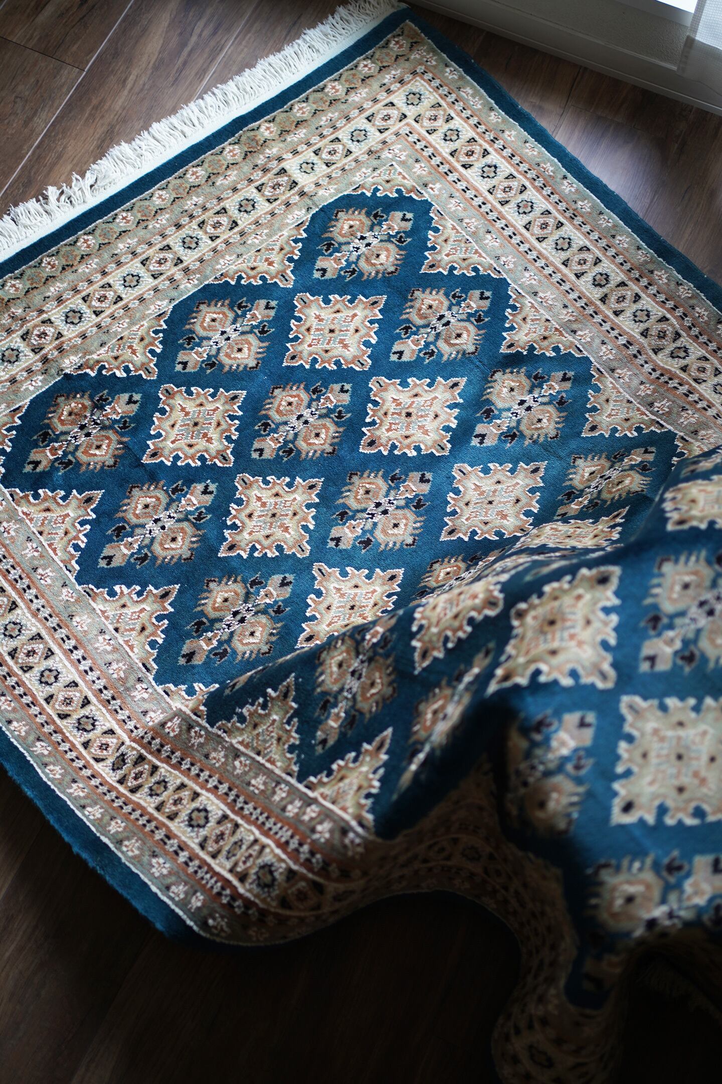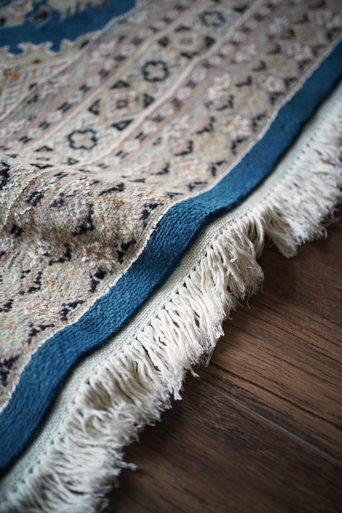 見ているだけでうっとりしてしまうほど鮮やかで美しいターコイズブルーのパキスタンラグ。ターコイズブルーにあわせて使われた肌色・くすんだ水色・濃紺の組み合わせも素晴らしいセンスを感じさせます。表面はふわっと滑らかな気持ちの良い肌触りで、厚みは8mm程度。パイル全体には光沢感のある艶が広がり、統一感のあるフラットな毛並みで大変上質感があります。ダメージも見受けられずパーフェクトなコンディション。お迎えいただいた方はこのラグを広げた時にきっとこの美しさに驚かれると思いますよ♪