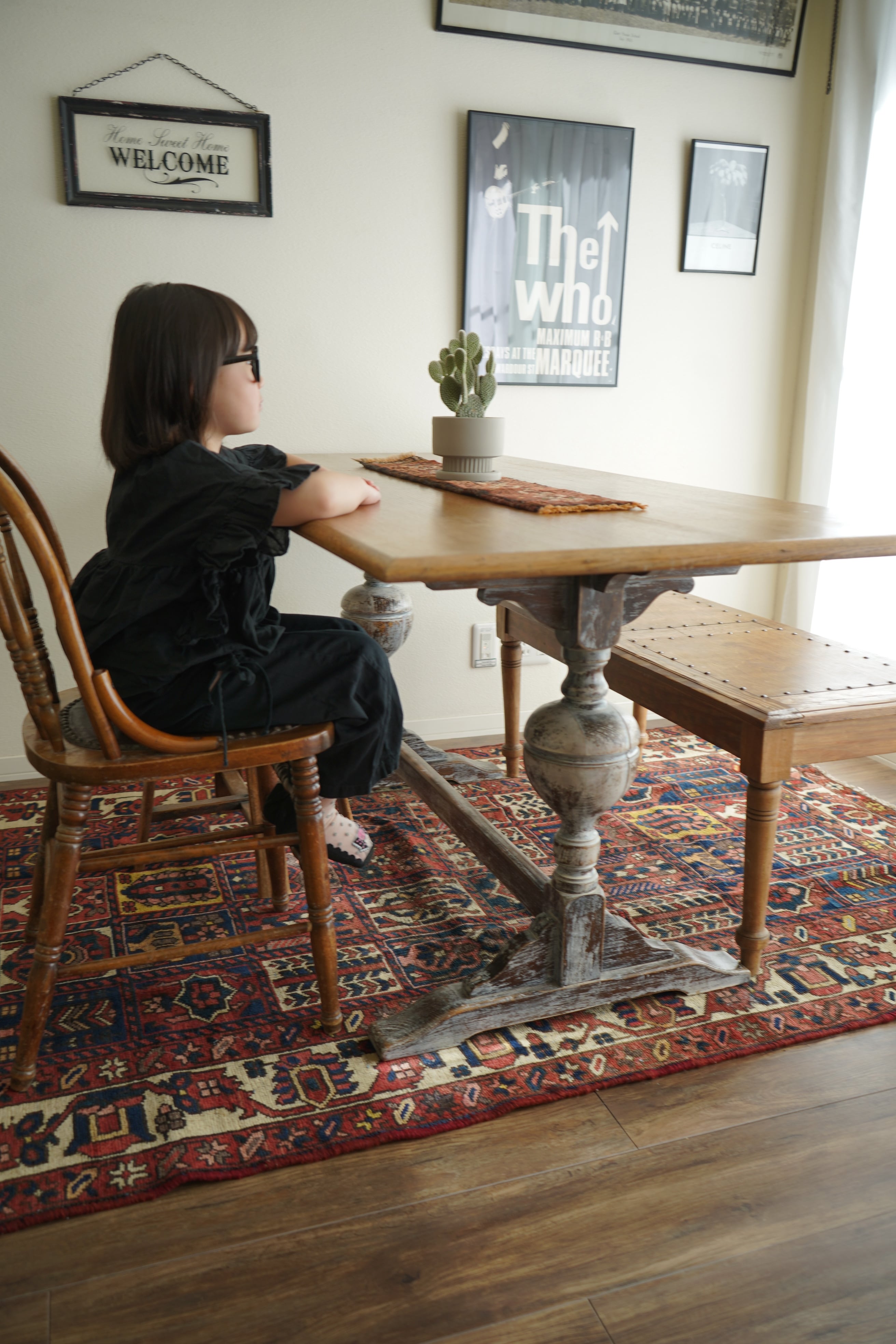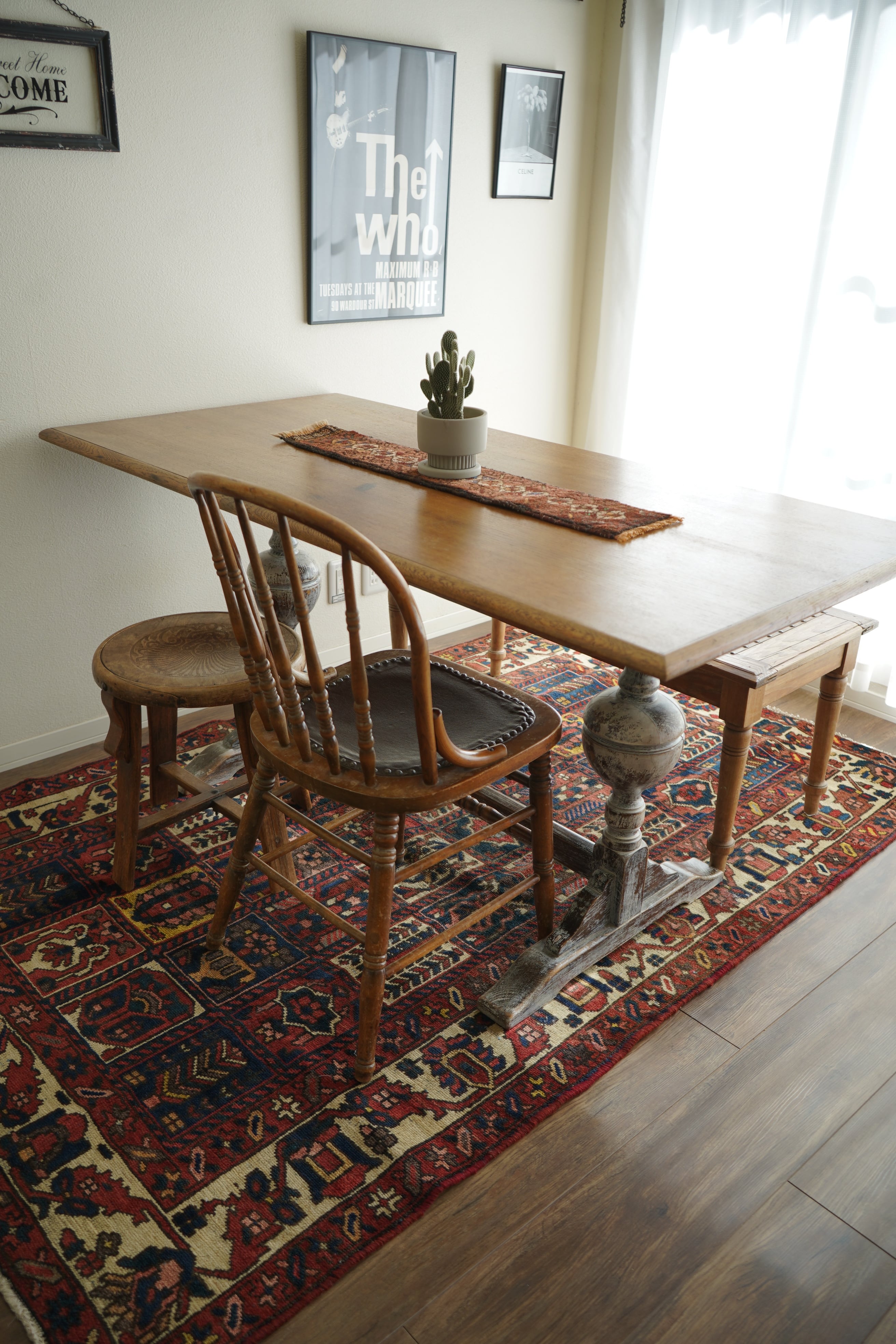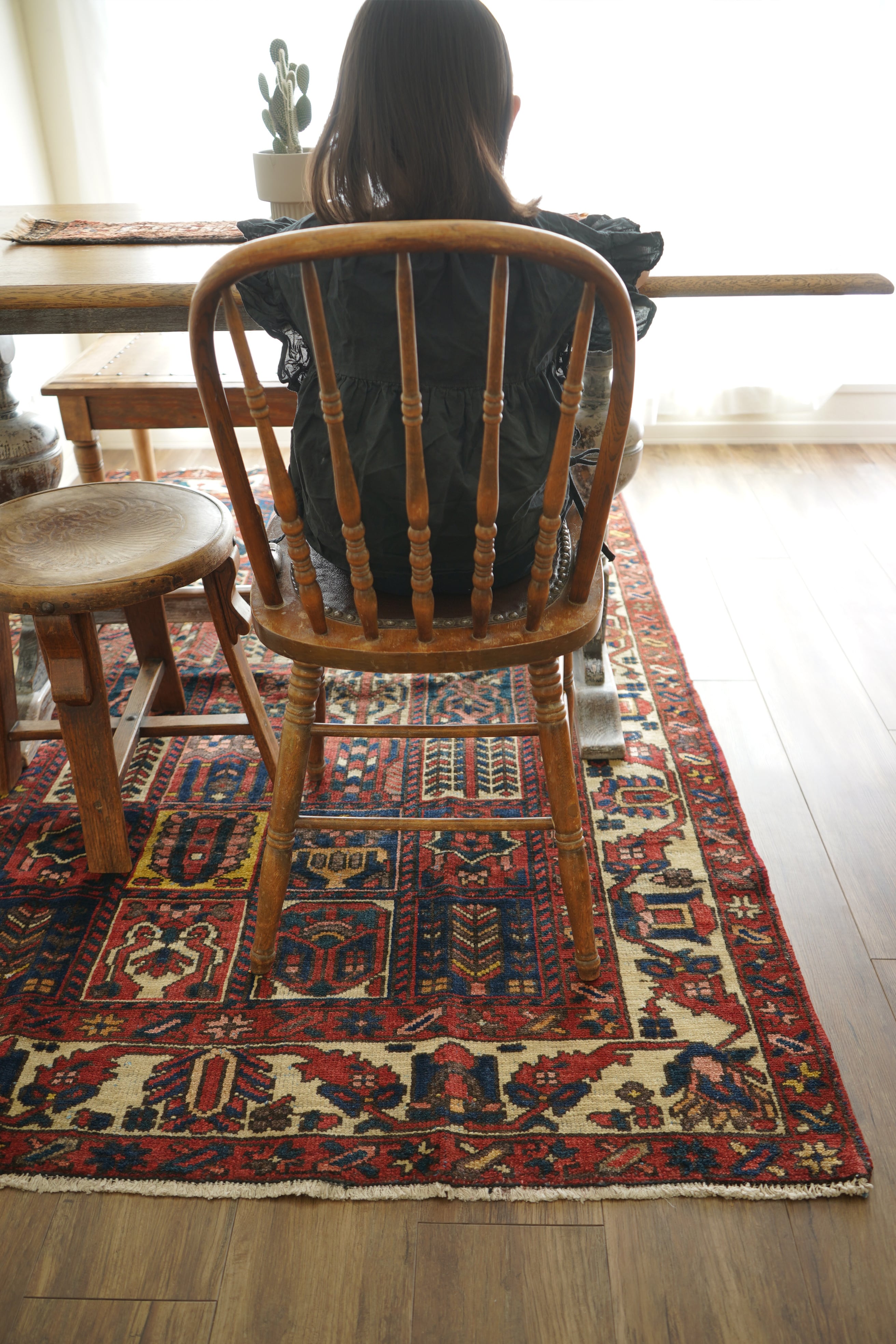 イラン西部、ザクロス山脈周辺の高原地域に住むバクティアリ族によって織られたラグです。縦横に規則正しく区切られたパネル紋様は"char mahal"と呼ばれる四季を意味するデザインで、美しい花の紋様などが織り込まれています。配色はピンクレッドをベースにオフホワイト、濃紺、ブルーグリーン、淡いピンク、黄土色など。表面はサラッとしつつ、優しいパイルの質感が感じられる肌触り。厚みは7mmほど。目立ったダメージも見受けられず大変良好なコンディション。リビングや寝室、ダイニングテーブル下にどうぞ。