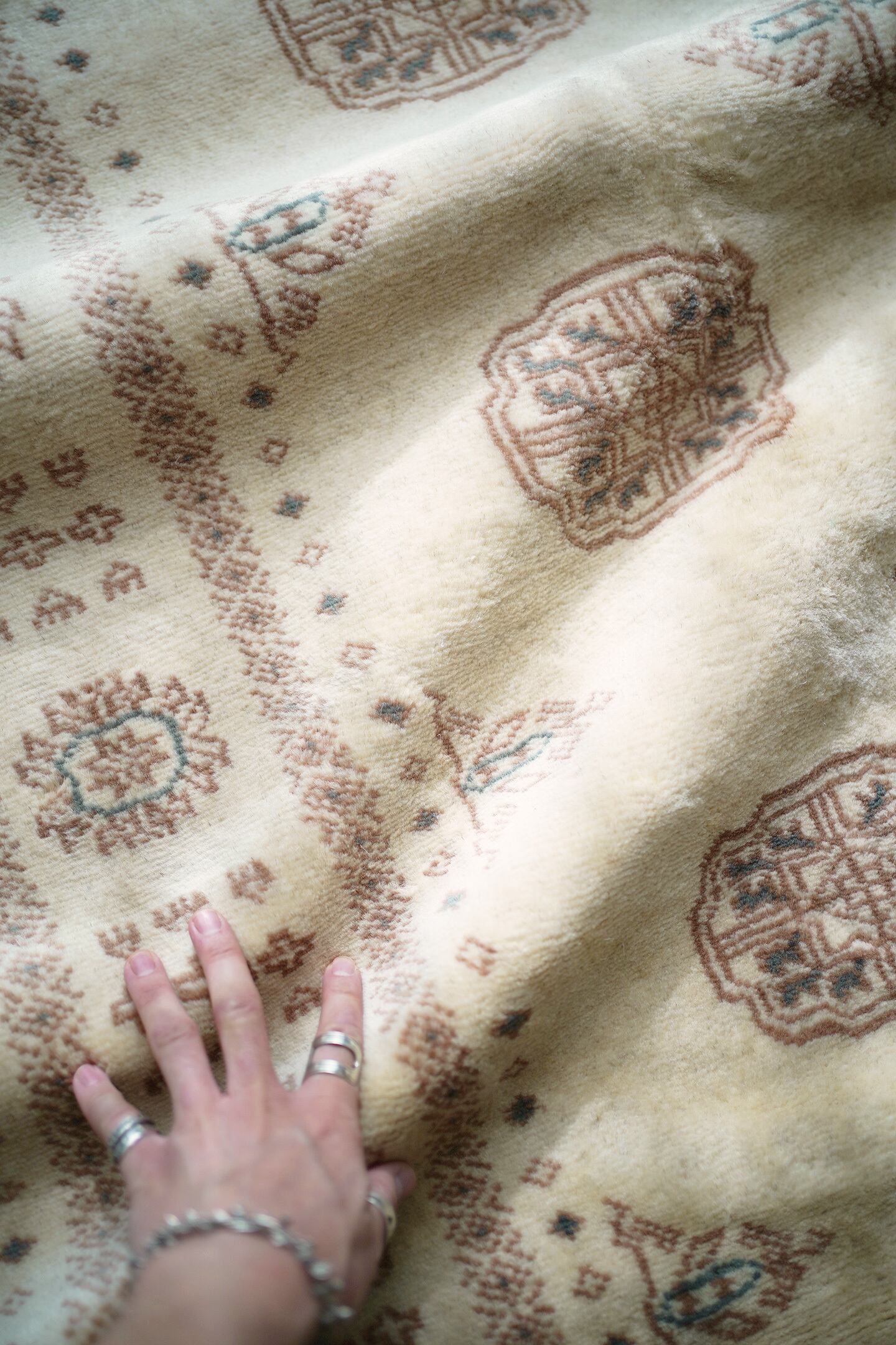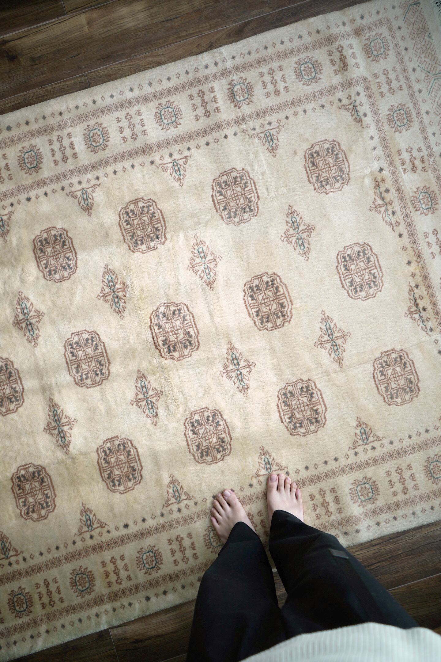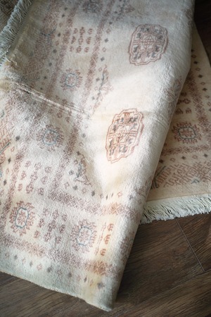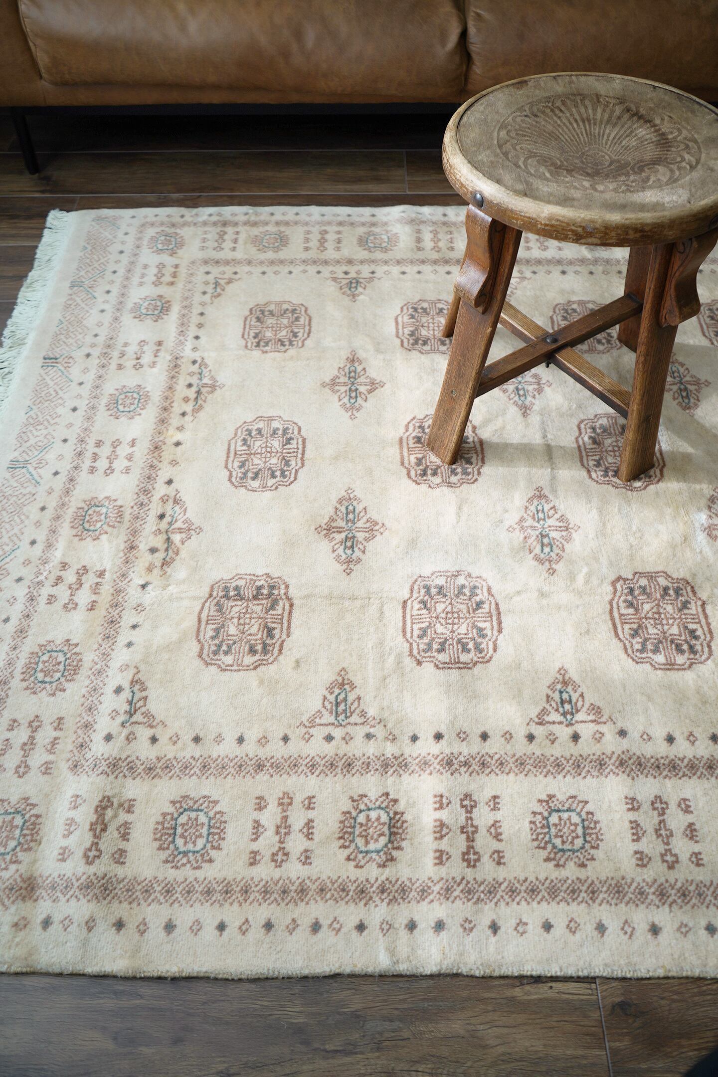 もふもふとしたウサギのような優しい雰囲気が素敵なパキスタンラグ。ソフトウールでふわっともっちりした柔らかさがとても気持ちよく、いつまでも絨毯の上で寛いでいたくなる質感がたまりません。"ボハラ"と呼ばれる象の足跡をモデルにしたとされる紋様が織り込まれたデザインで、ほっこりするような風合いが魅力的な一枚。配色はアイボリーをベースに、ブラウンとベージュの中間色、アクセントカラーにくすんだミントグリーンが使われていて非常に可愛らしいです。厚みは9mmほど。目立ったダメージもなく大変良好なコンディション。リビングのソファ前に敷いていただき、ゆったりと時間を過ごしてみてください♪