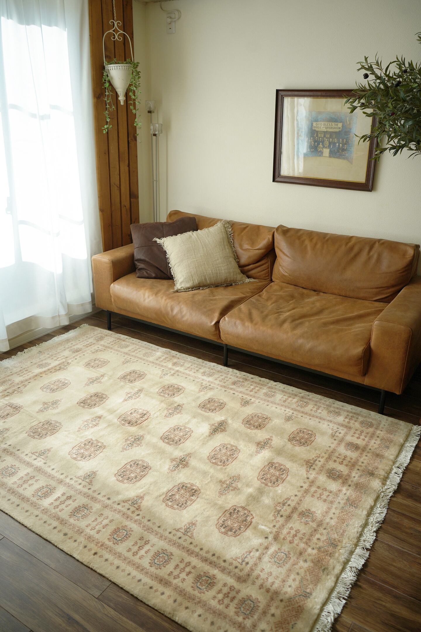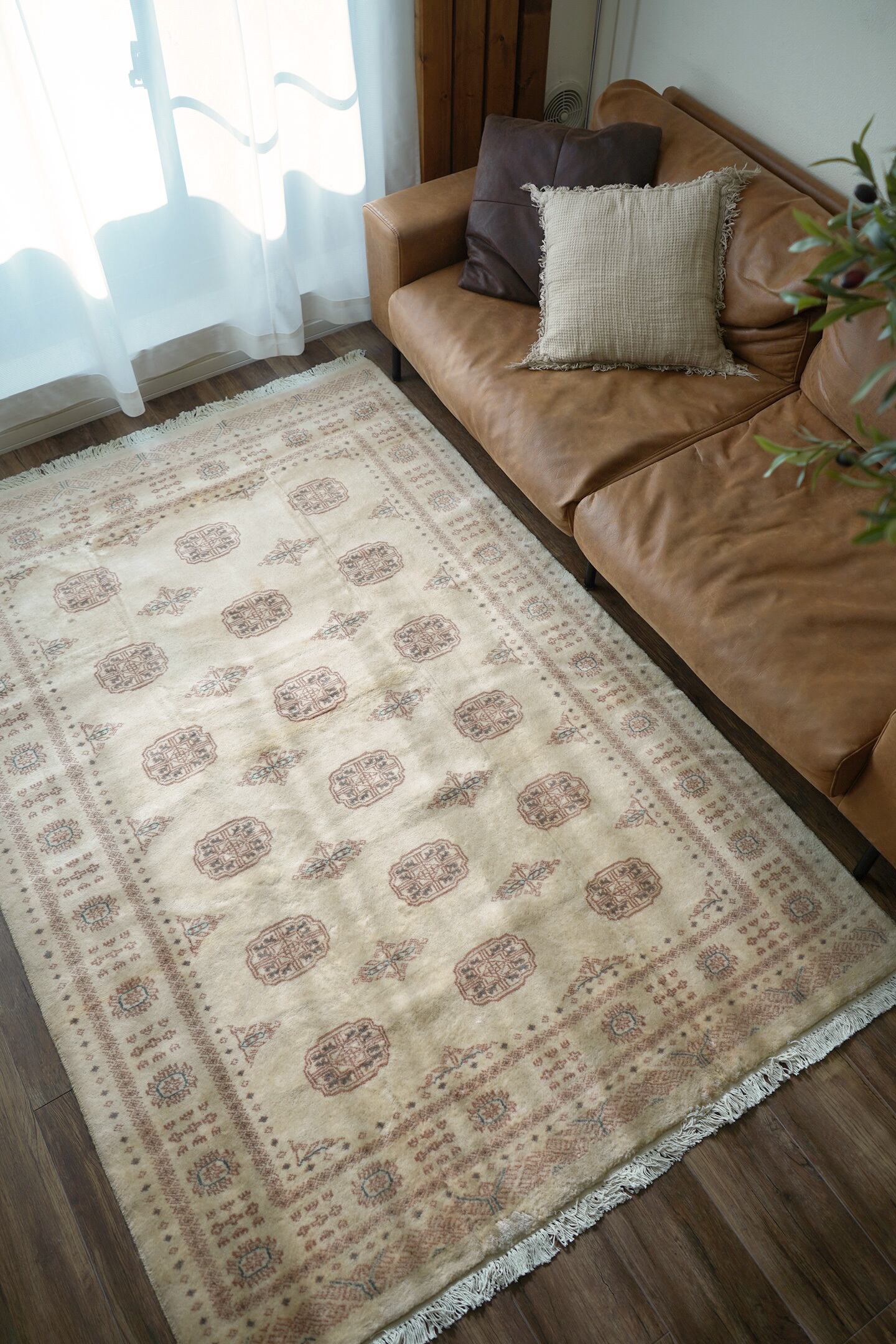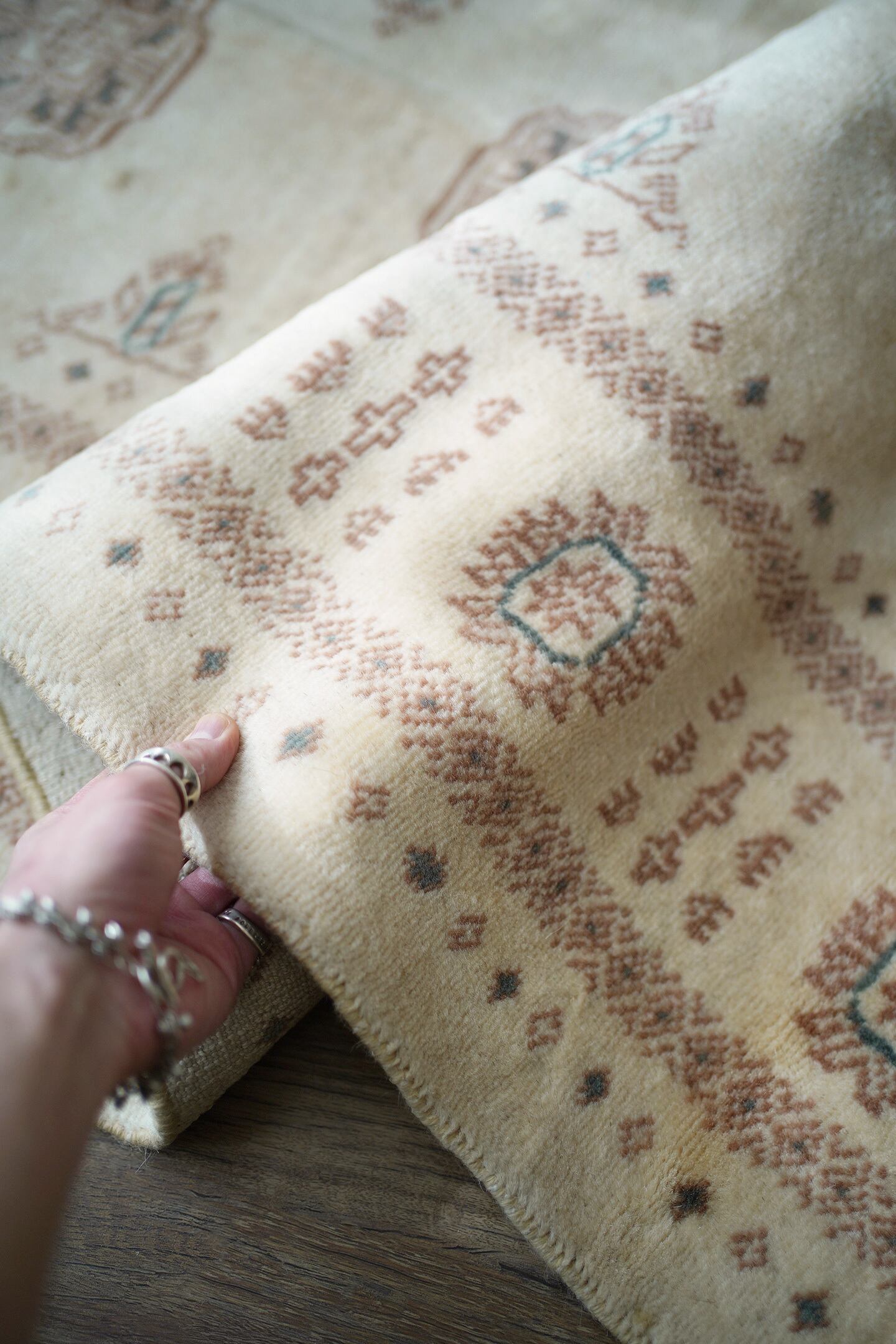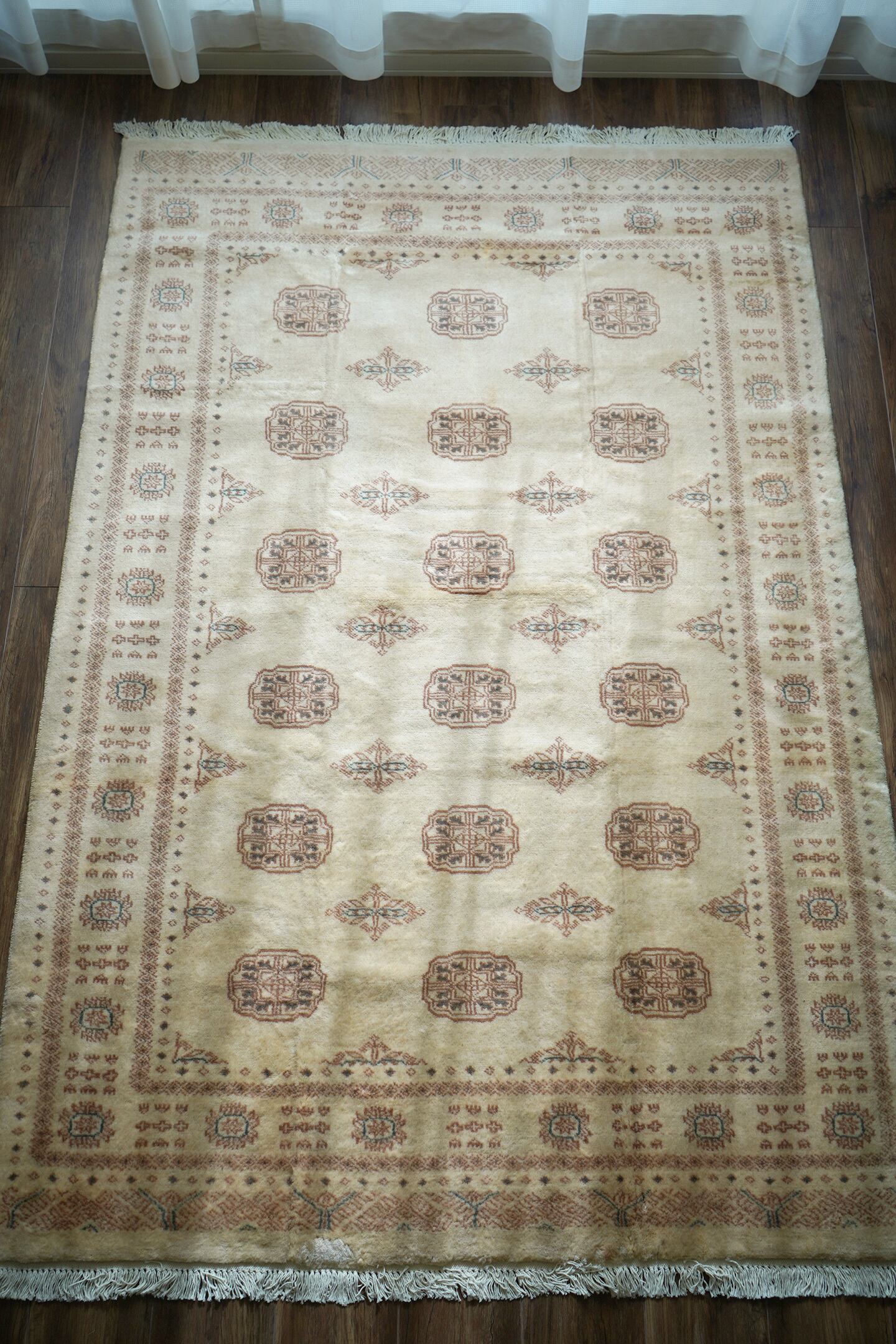 もふもふとしたウサギのような優しい雰囲気が素敵なパキスタンラグ。ソフトウールでふわっともっちりした柔らかさがとても気持ちよく、いつまでも絨毯の上で寛いでいたくなる質感がたまりません。"ボハラ"と呼ばれる象の足跡をモデルにしたとされる紋様が織り込まれたデザインで、ほっこりするような風合いが魅力的な一枚。配色はアイボリーをベースに、ブラウンとベージュの中間色、アクセントカラーにくすんだミントグリーンが使われていて非常に可愛らしいです。厚みは9mmほど。目立ったダメージもなく大変良好なコンディション。リビングのソファ前に敷いていただき、ゆったりと時間を過ごしてみてください♪
