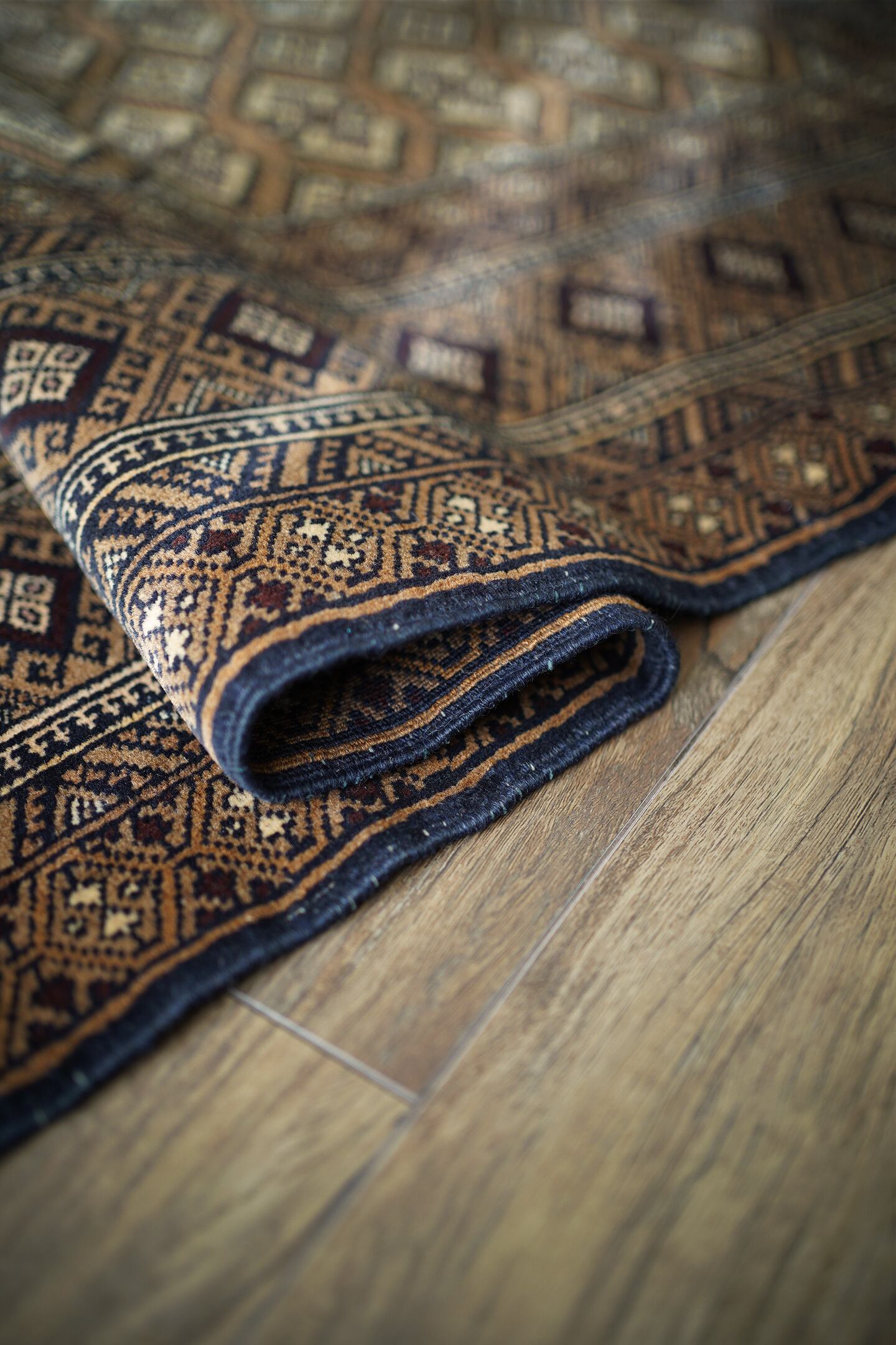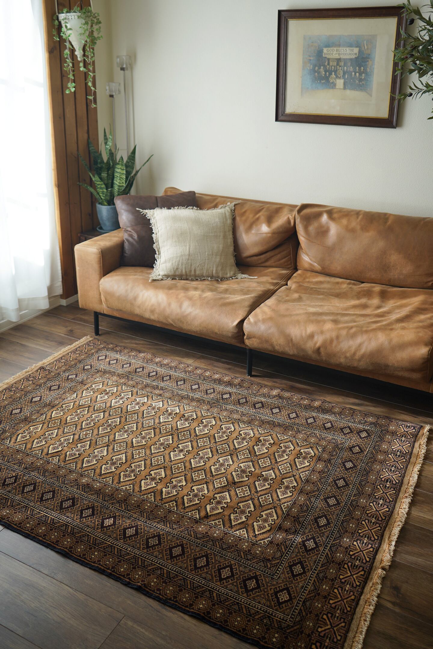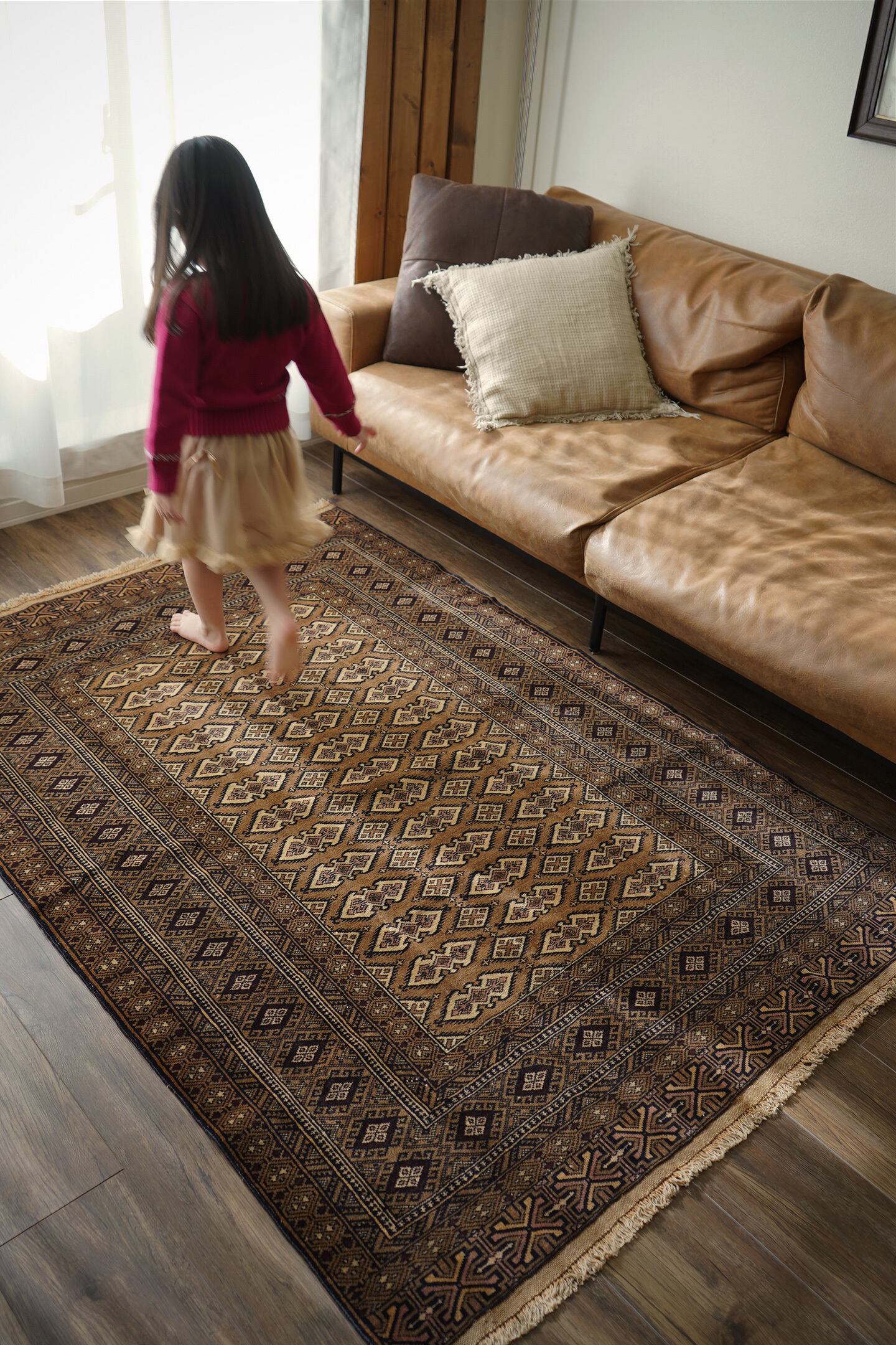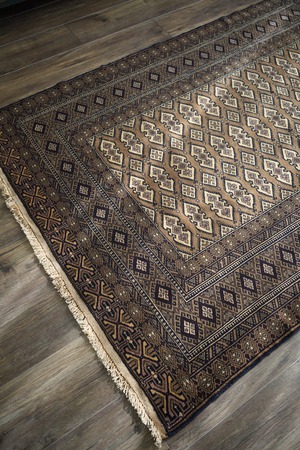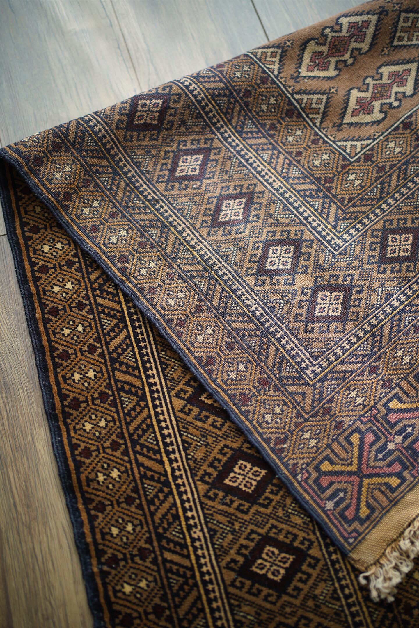 約30年前にアフガニスタンに居住するバルーチ族によって織られたラグです。バランスの取れたデザインかつ、ブラウン・焦茶・ブラックの統一感のある落ち着いたお色味で、ご家庭のインテリアとも非常にコーディネートしやすい一枚かと思います。フリンジ部分はシンプルなキリムエンドの作り。毛足は短めのタイプで、目の詰まった繊細な織りで作られており、フラットに綺麗に整った長さの毛並みが高品質を感じさせます。表面はしっとり滑らかで気持ちの良い肌触りをしており、厚みは6mm程度。通年で気持ちよくご利用いただける質感かと思います。使用感がほとんど見られない未使用に近い綺麗なラグで、コンディションもパーフェクトです。