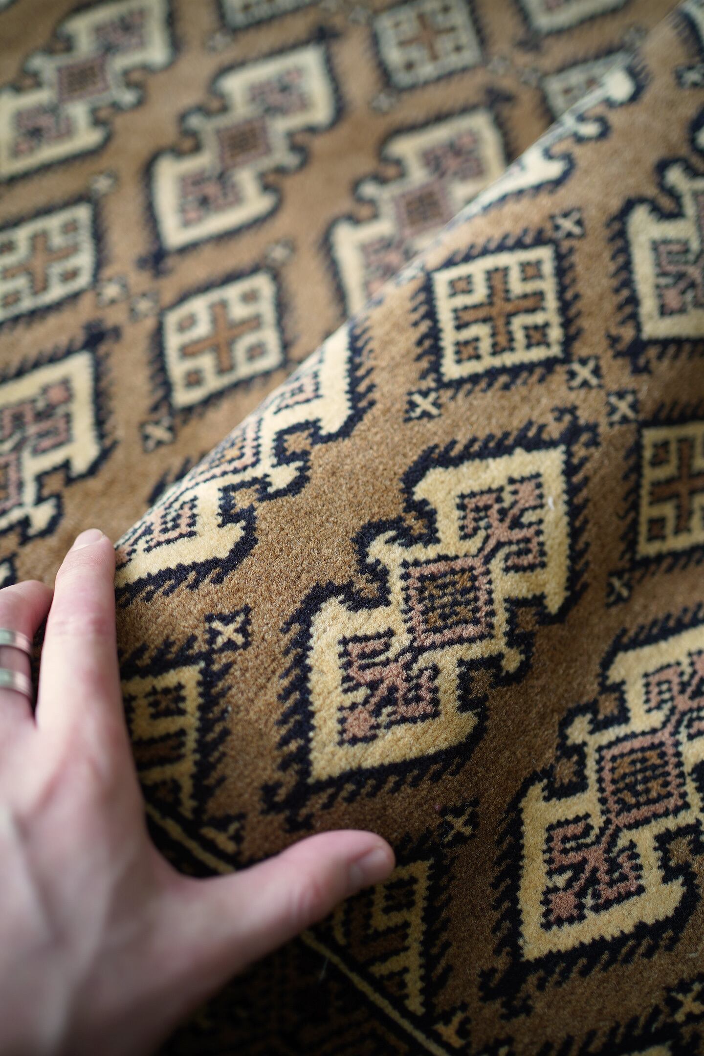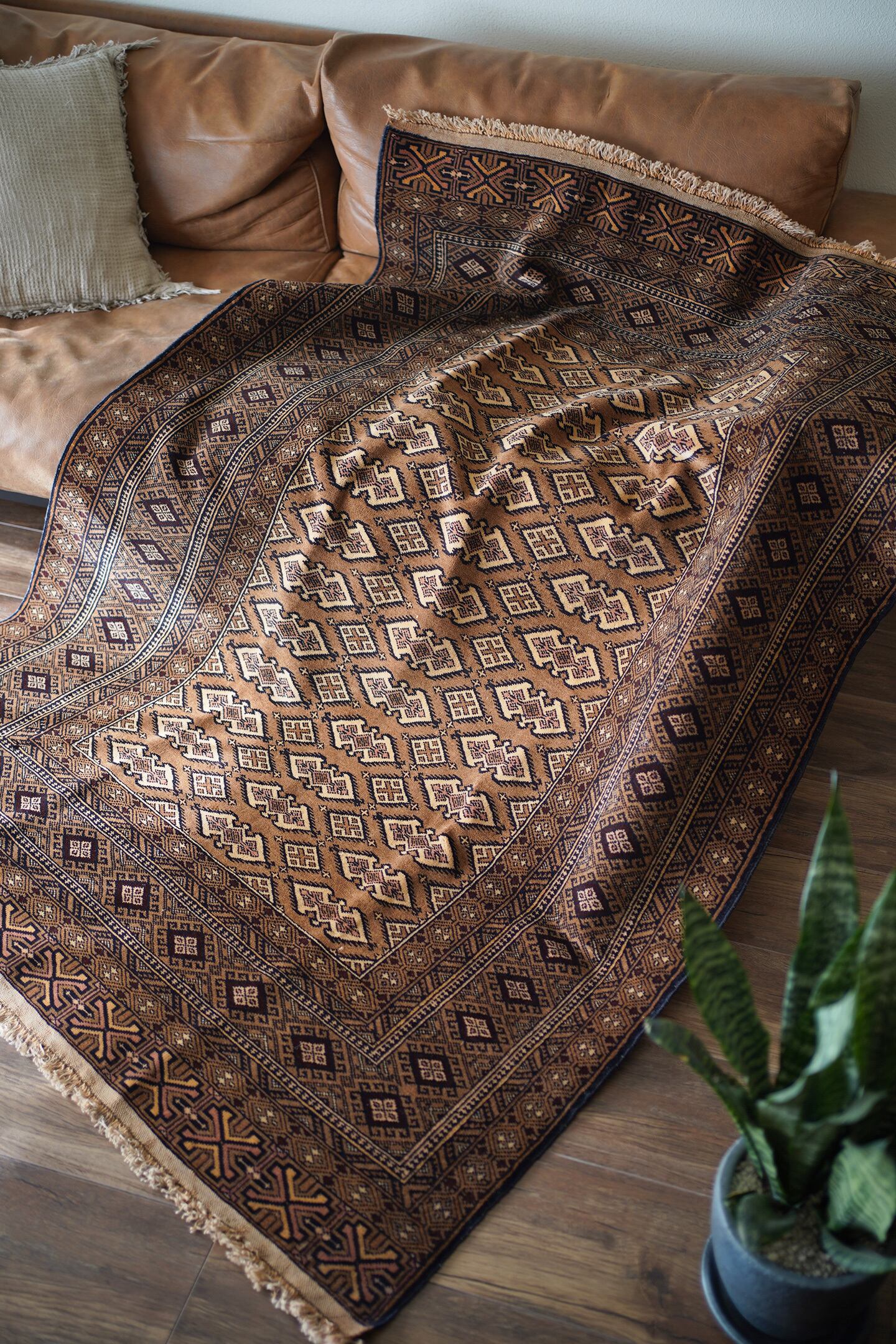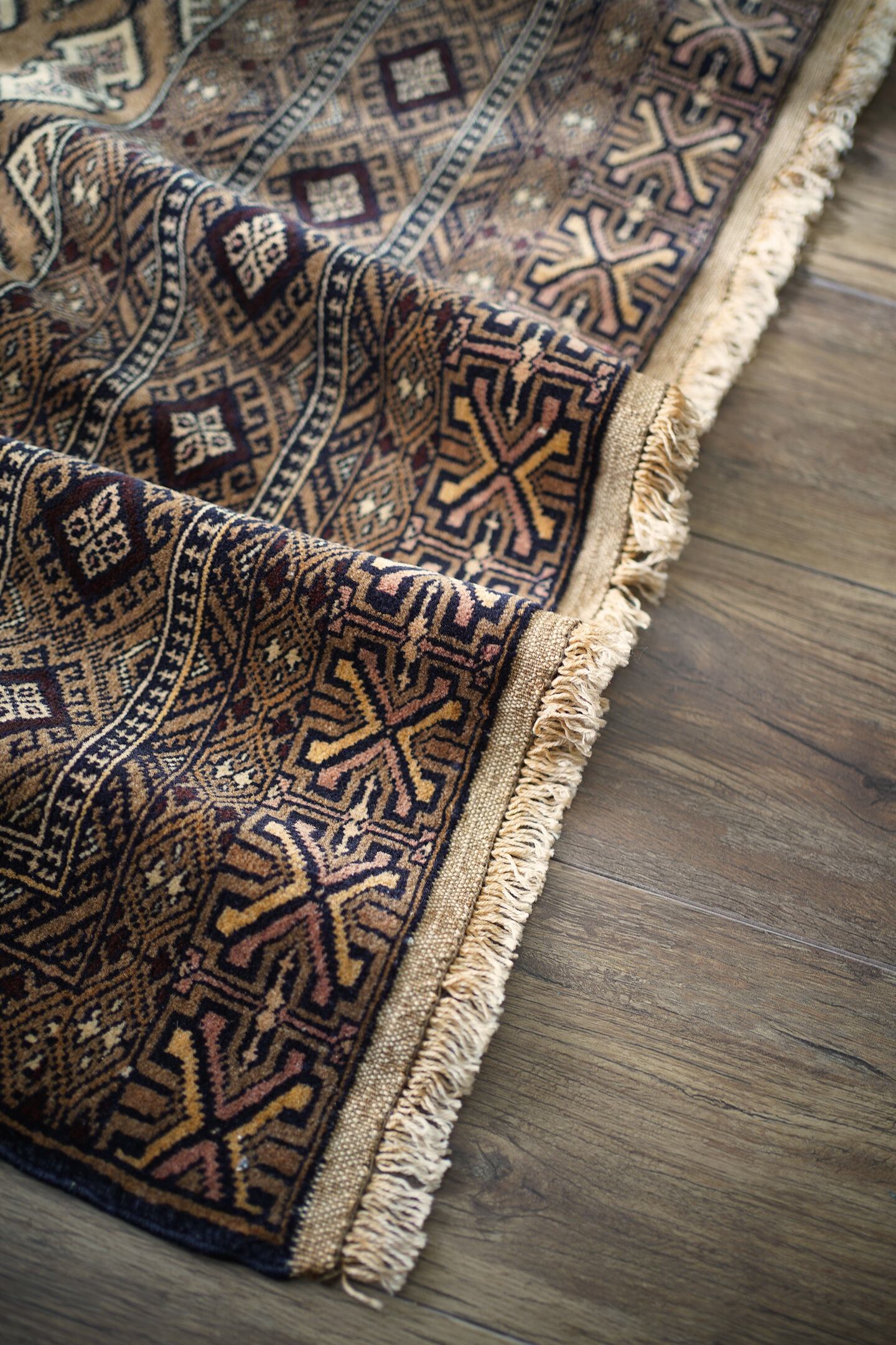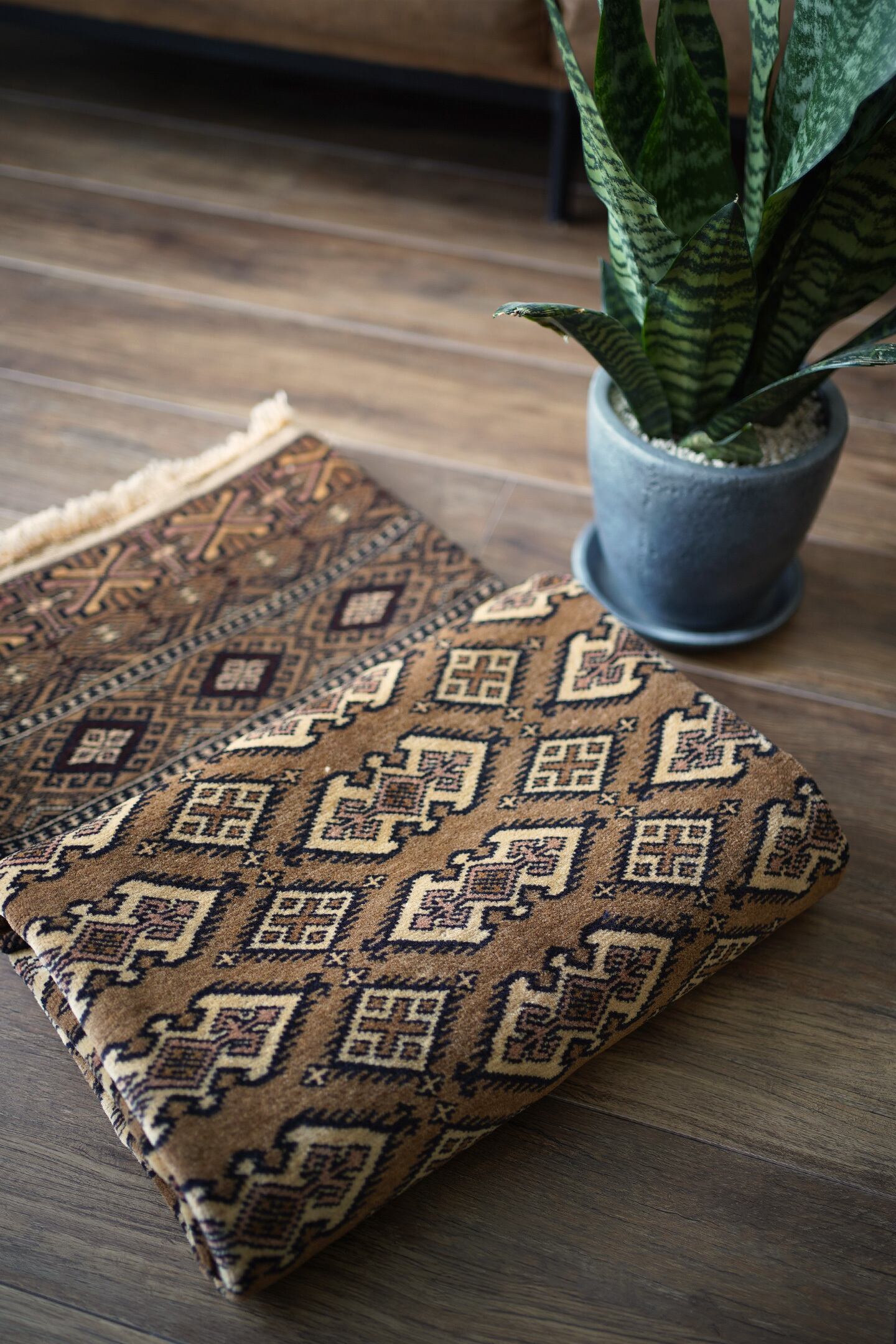 約30年前にアフガニスタンに居住するバルーチ族によって織られたラグです。バランスの取れたデザインかつ、ブラウン・焦茶・ブラックの統一感のある落ち着いたお色味で、ご家庭のインテリアとも非常にコーディネートしやすい一枚かと思います。フリンジ部分はシンプルなキリムエンドの作り。毛足は短めのタイプで、目の詰まった繊細な織りで作られており、フラットに綺麗に整った長さの毛並みが高品質を感じさせます。表面はしっとり滑らかで気持ちの良い肌触りをしており、厚みは6mm程度。通年で気持ちよくご利用いただける質感かと思います。使用感がほとんど見られない未使用に近い綺麗なラグで、コンディションもパーフェクトです。