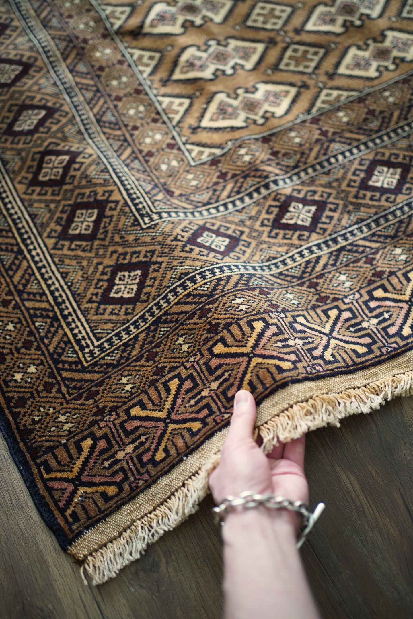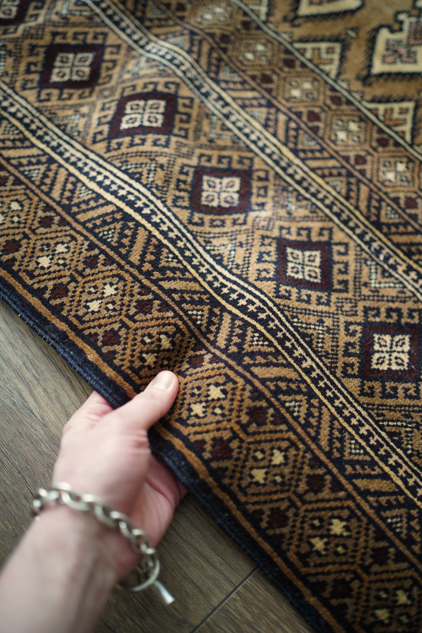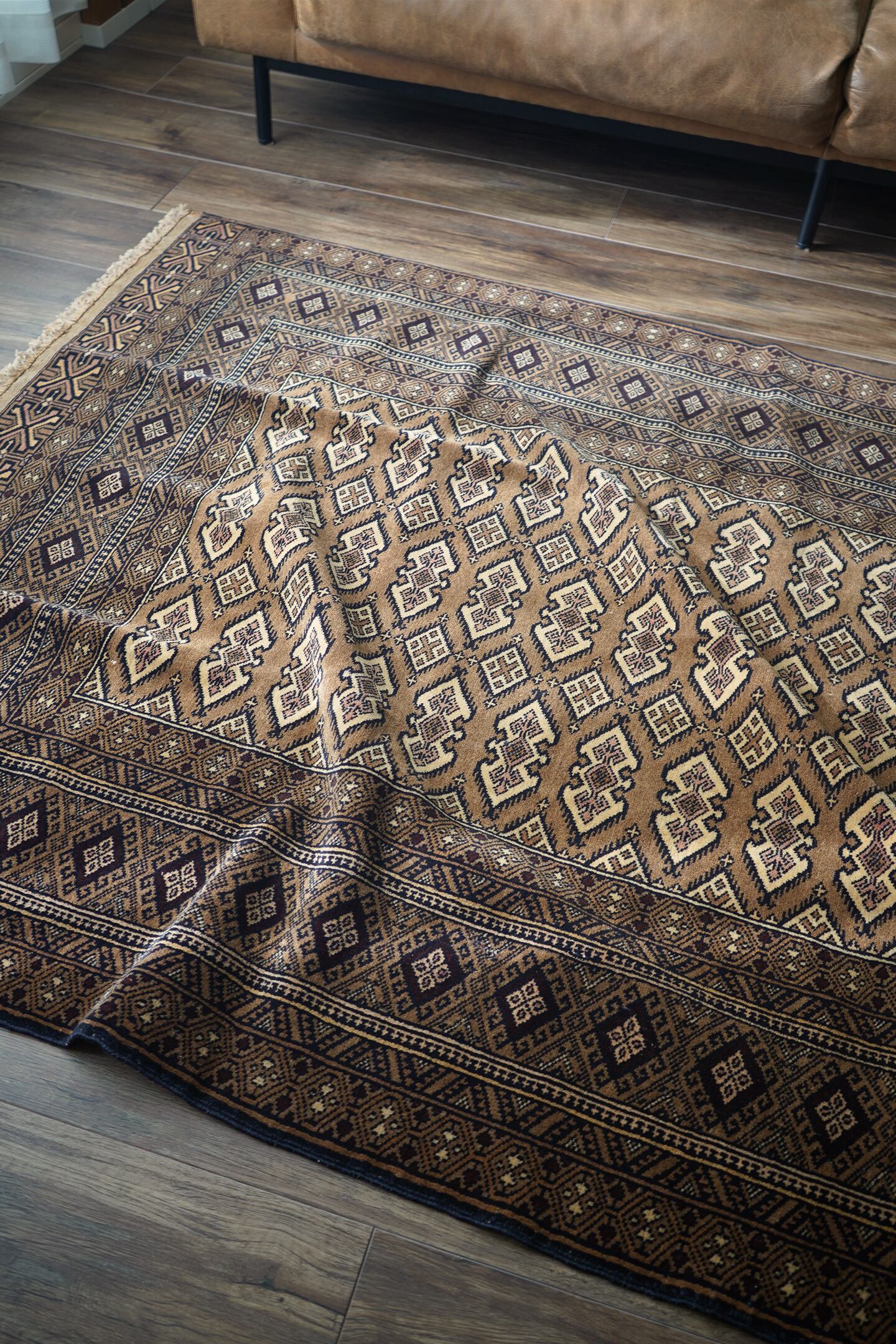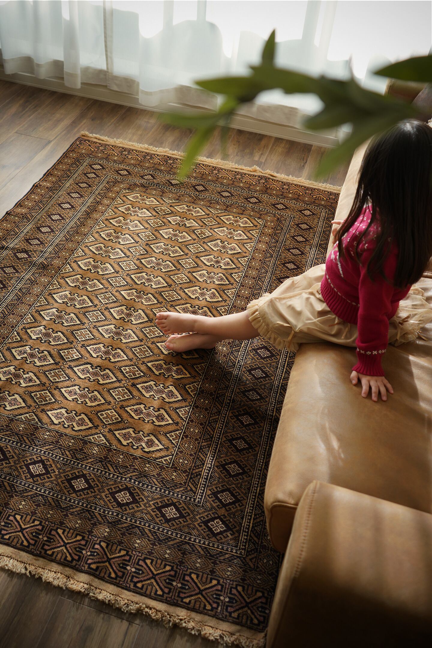 約30年前にアフガニスタンに居住するバルーチ族によって織られたラグです。バランスの取れたデザインかつ、ブラウン・焦茶・ブラックの統一感のある落ち着いたお色味で、ご家庭のインテリアとも非常にコーディネートしやすい一枚かと思います。フリンジ部分はシンプルなキリムエンドの作り。毛足は短めのタイプで、目の詰まった繊細な織りで作られており、フラットに綺麗に整った長さの毛並みが高品質を感じさせます。表面はしっとり滑らかで気持ちの良い肌触りをしており、厚みは6mm程度。通年で気持ちよくご利用いただける質感かと思います。使用感がほとんど見られない未使用に近い綺麗なラグで、コンディションもパーフェクトです。