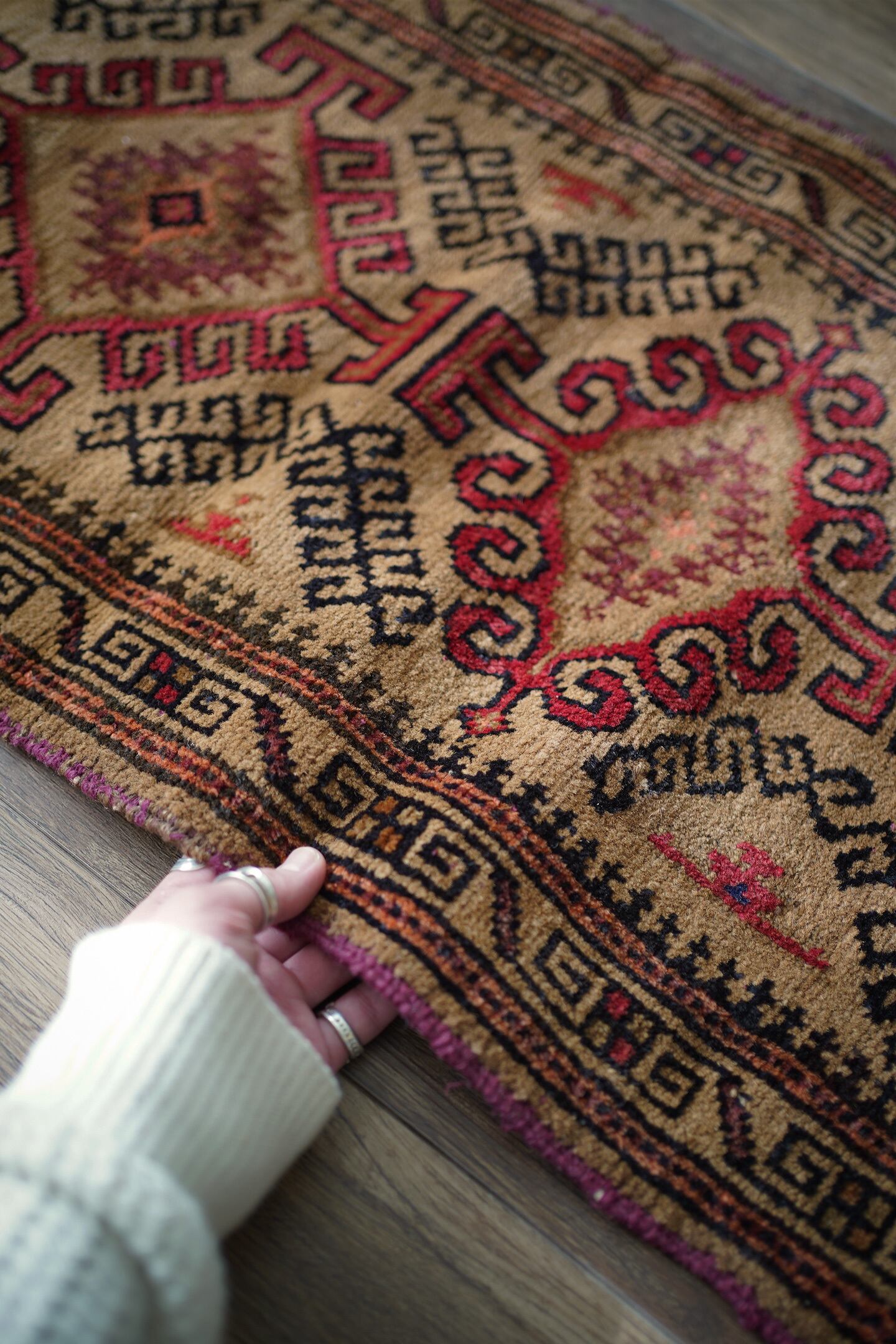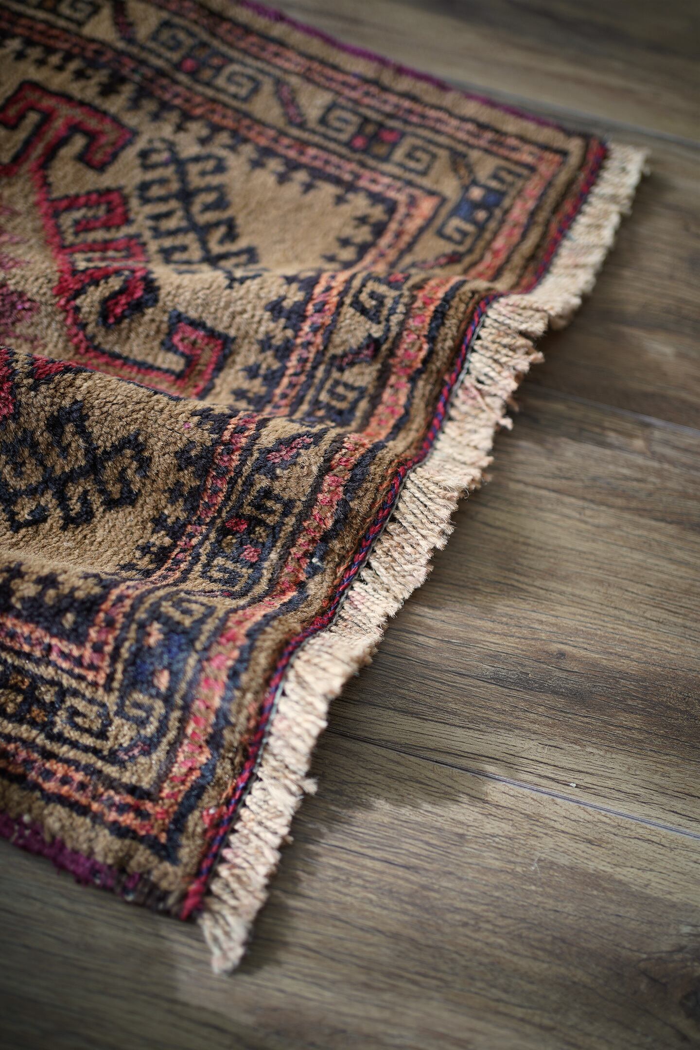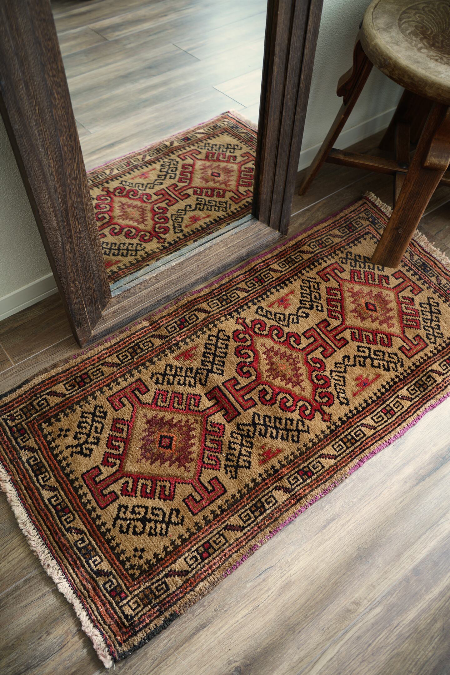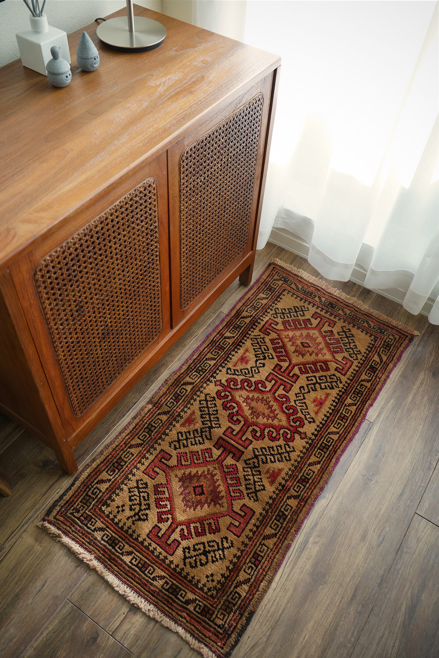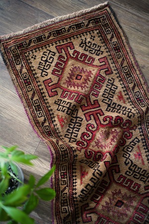 約60年前にバルーチ族によって織られたアフガニスタン産ラグです。キャメルカラーをベースにした柔らかい印象の一枚で、赤、黒、ブラウンなどが使われた配色です。カッコ良い雰囲気の三連のフックドメダリオンは、よく見ると真ん中だけ釣鐘型の部分が曲線になっているところがユニークです。表面はふわっと柔らかく優しい肌触りで、厚みは7mm程度。目立ったダメージもなく良好なコンディション。ラックやブックシェルフ前をはじめ、ちょっとしたスペースにどうぞ。