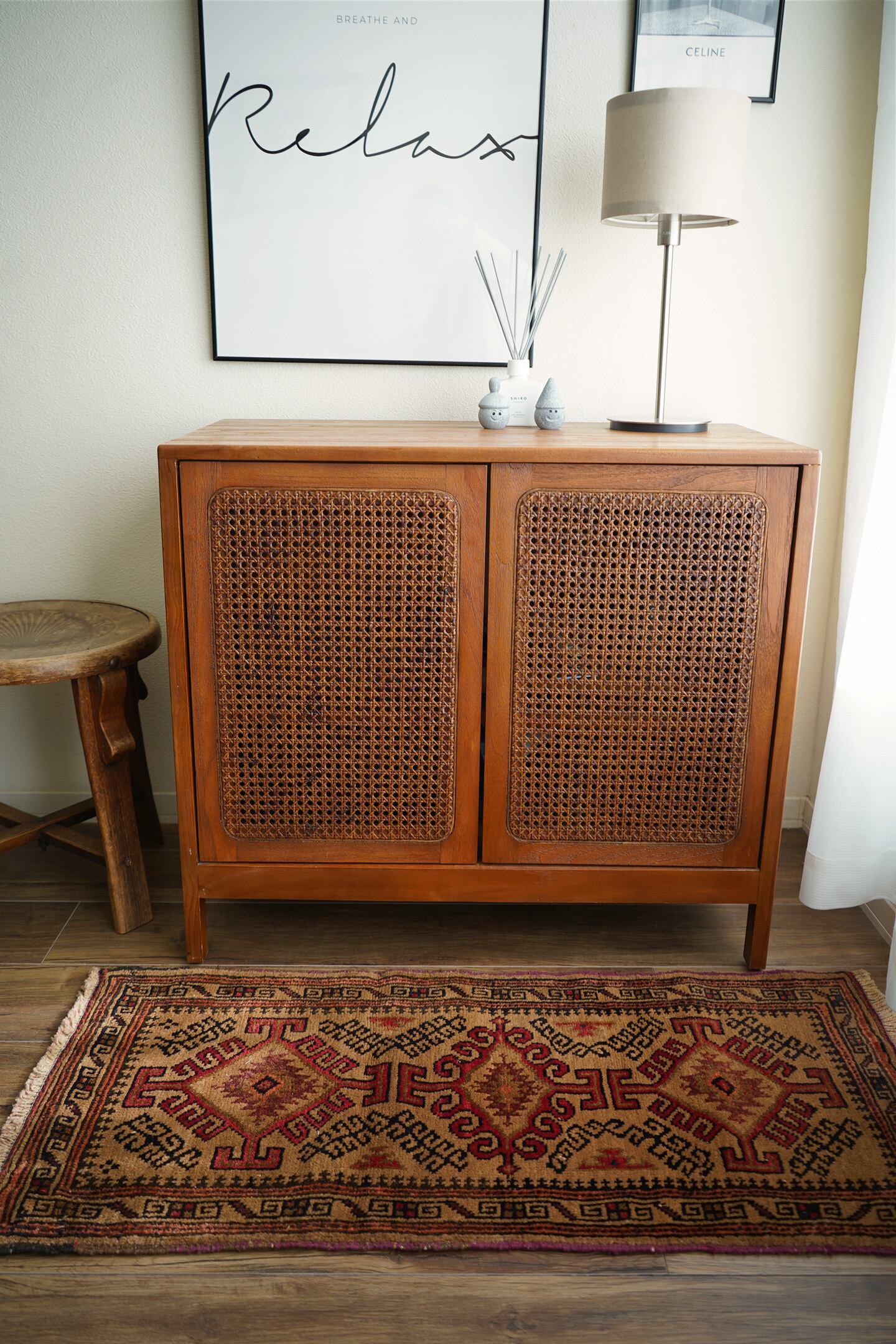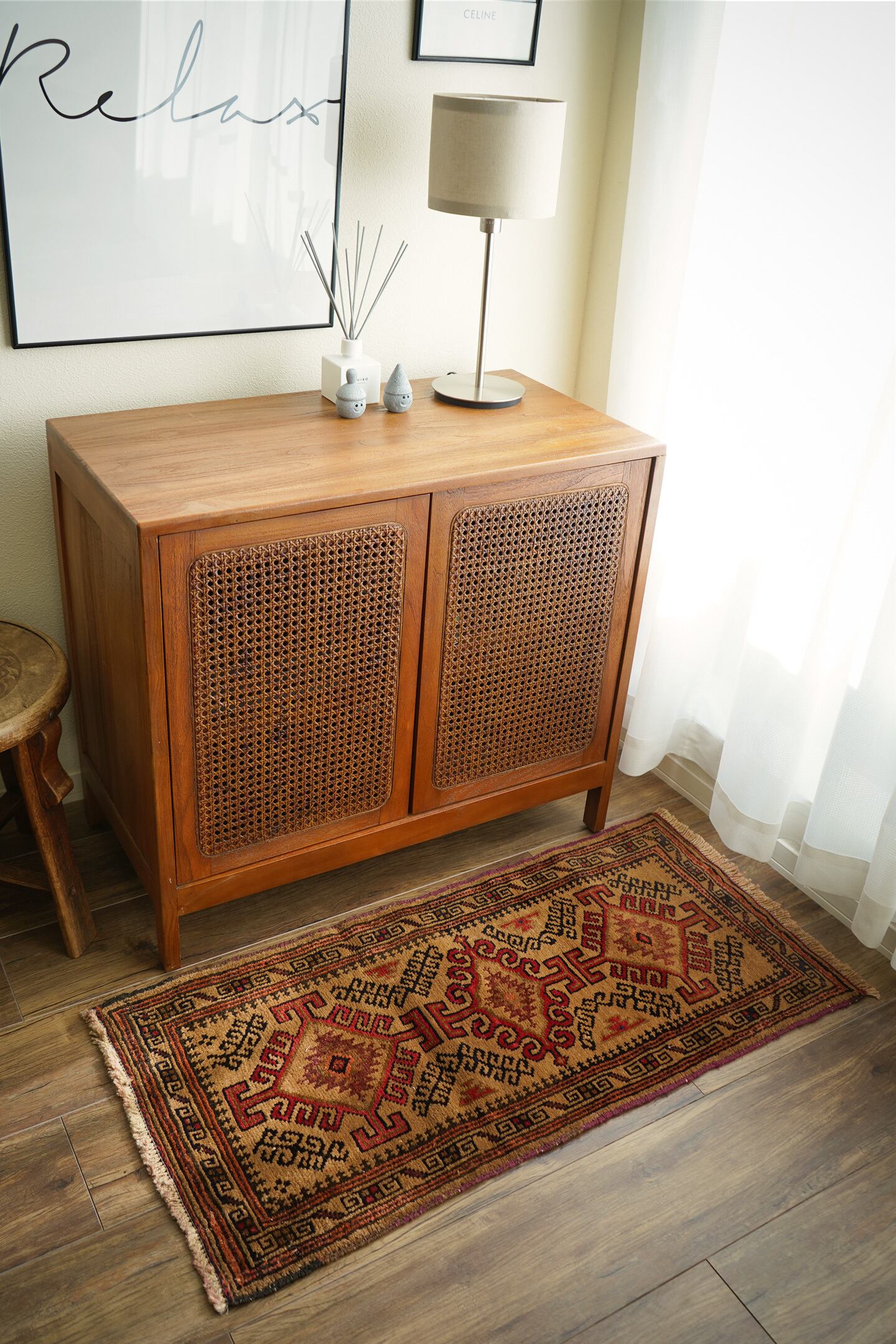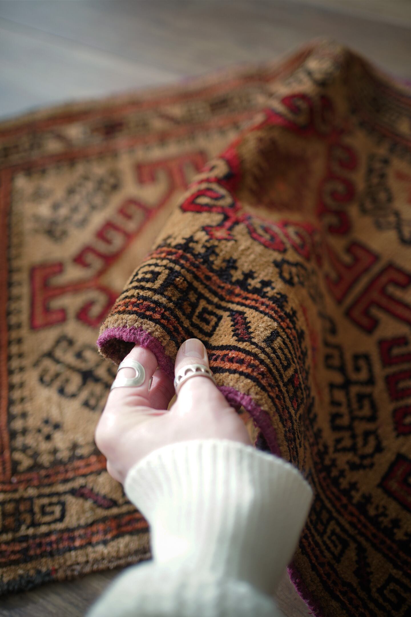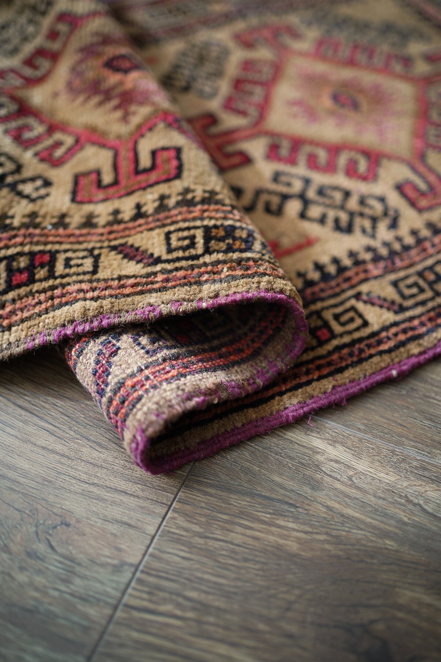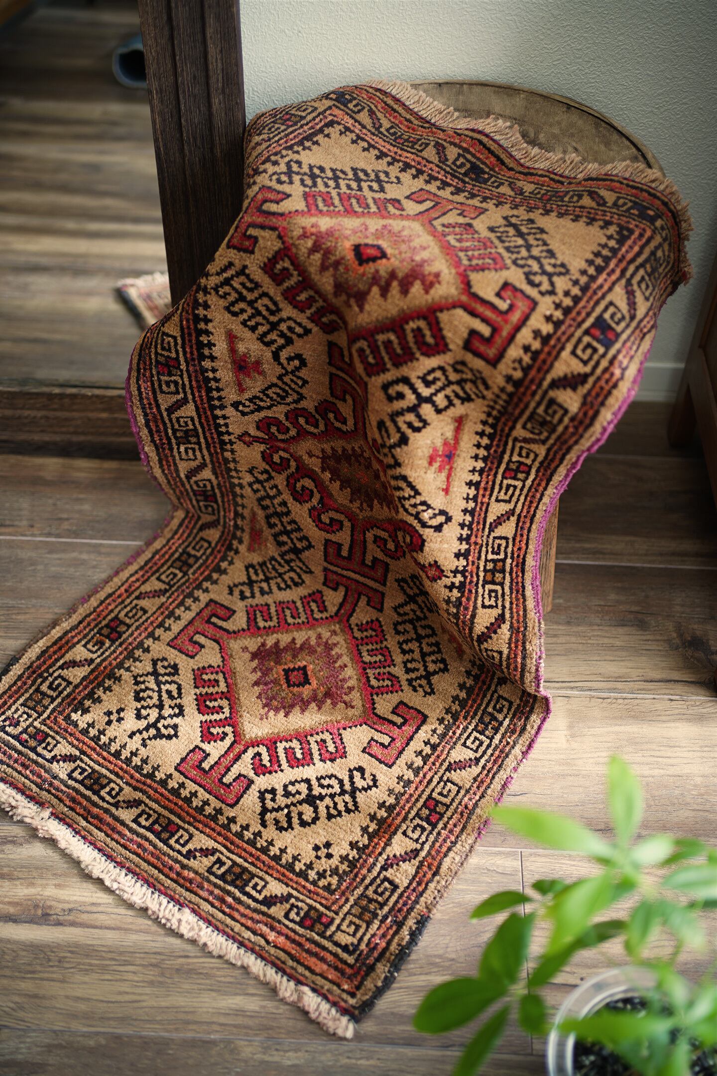 約60年前にバルーチ族によって織られたアフガニスタン産ラグです。キャメルカラーをベースにした柔らかい印象の一枚で、赤、黒、ブラウンなどが使われた配色です。カッコ良い雰囲気の三連のフックドメダリオンは、よく見ると真ん中だけ釣鐘型の部分が曲線になっているところがユニークです。表面はふわっと柔らかく優しい肌触りで、厚みは7mm程度。目立ったダメージもなく良好なコンディション。ラックやブックシェルフ前をはじめ、ちょっとしたスペースにどうぞ。