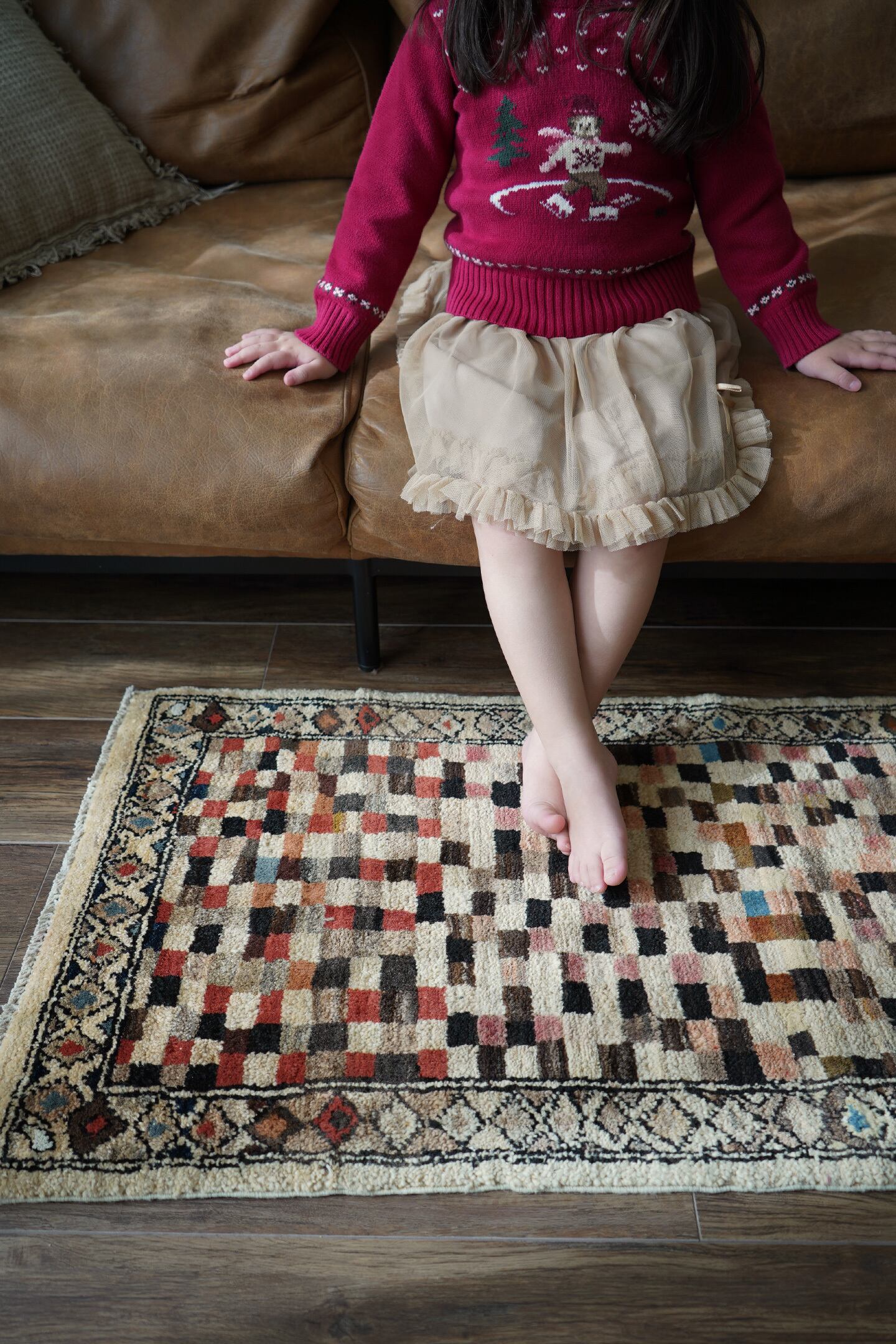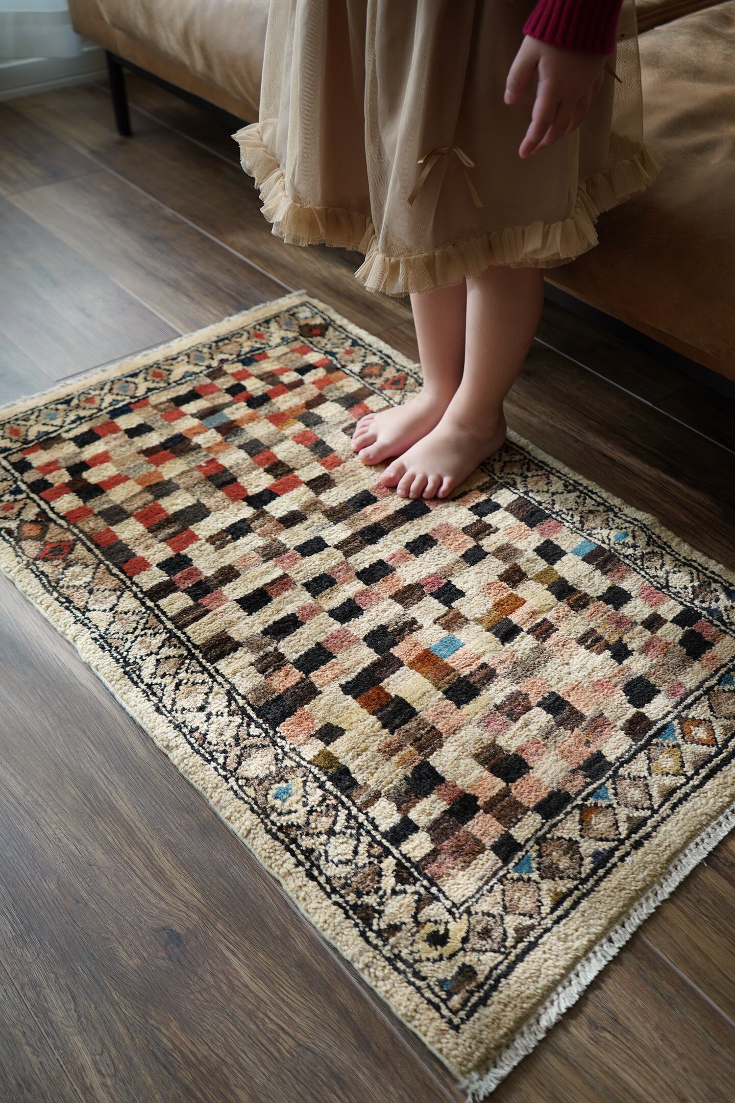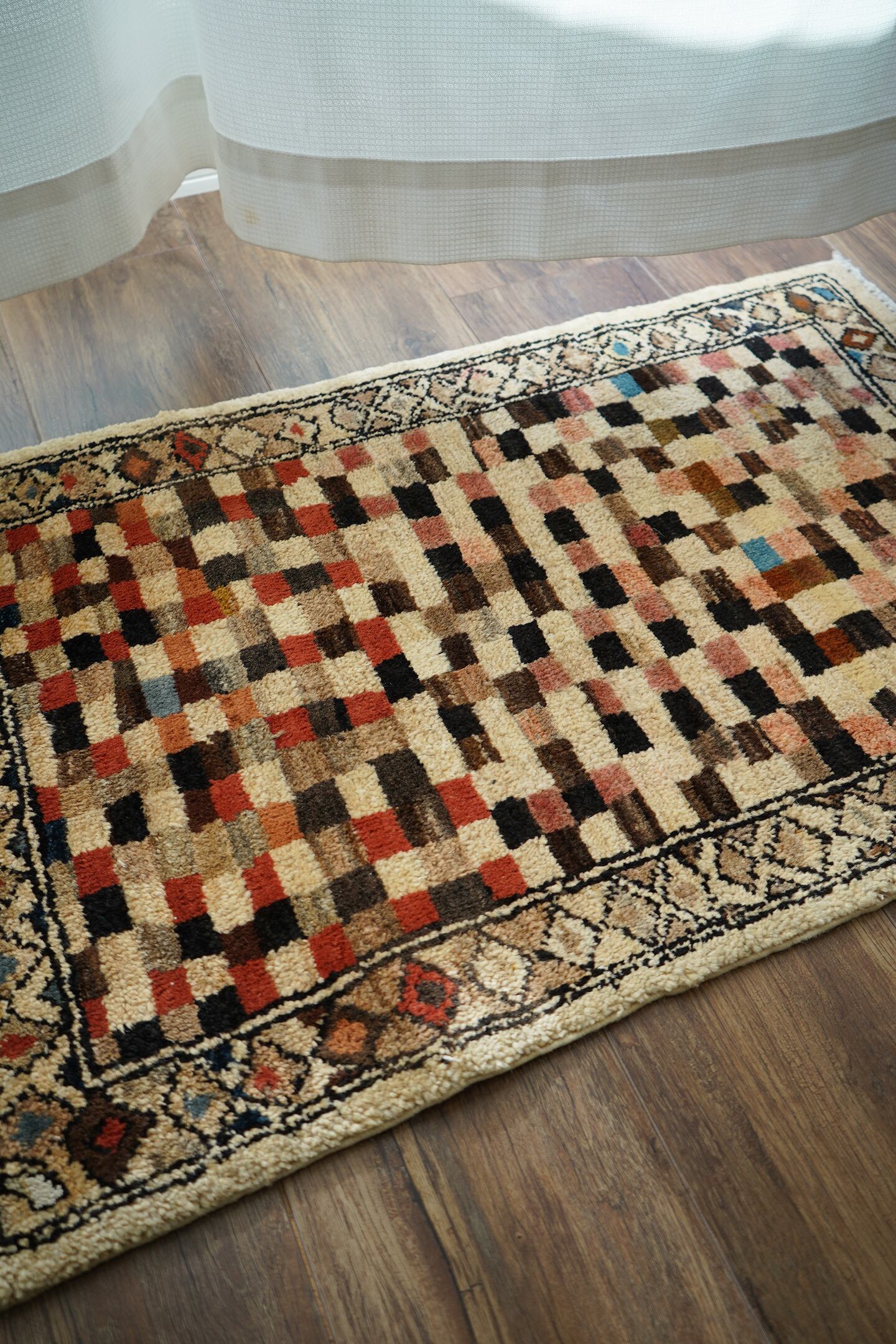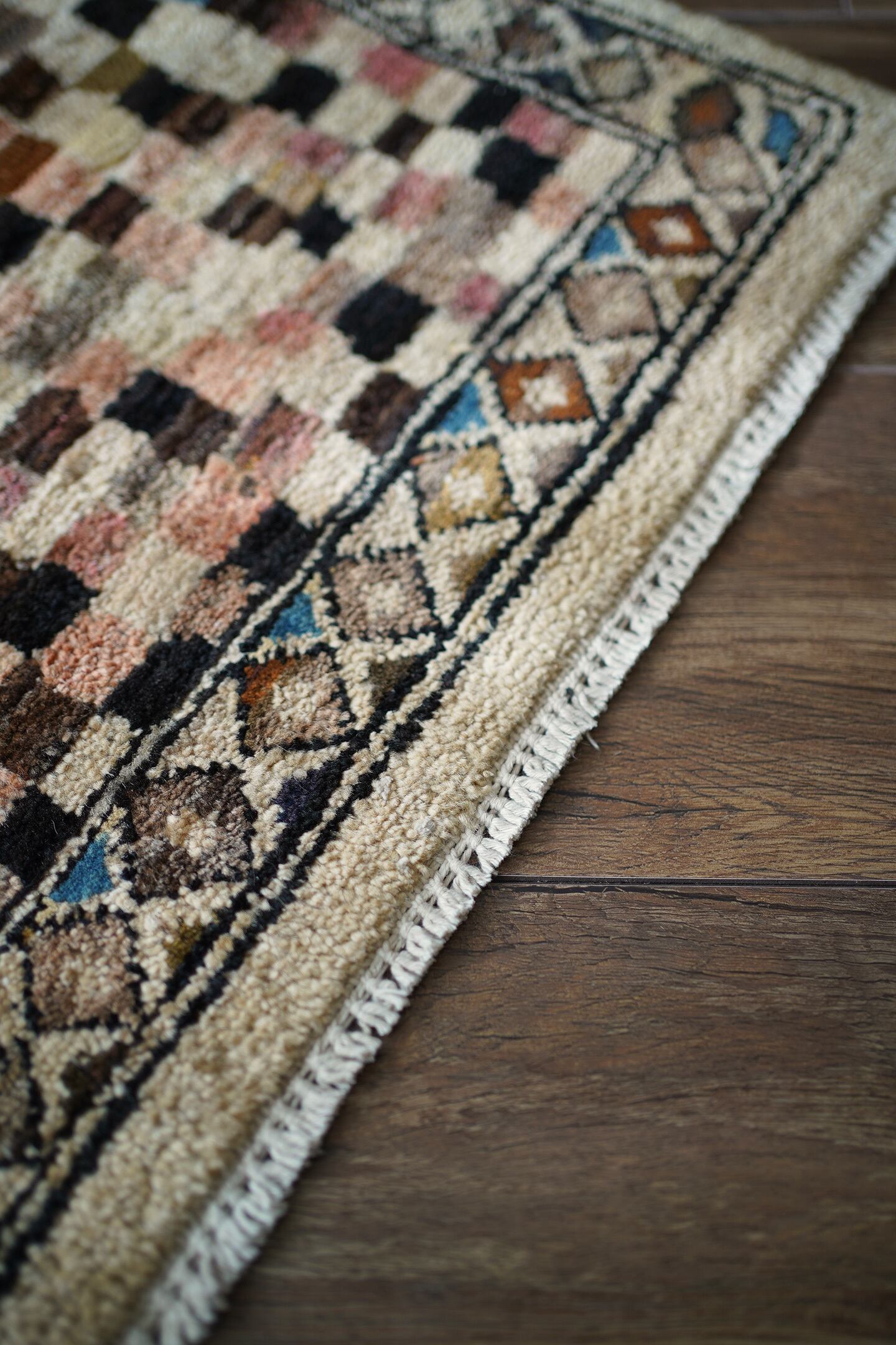 パキスタンとアフガニスタンの国境地域で作られた経年約10年〜15年のチョビラグ。モザイク調の珍しいデザインかつセンスのある配色に一目惚れして仕入れを決めた一枚です。モザイク部分は朱色から淡いピンクのグラデーションになっており、一部水色がアクセントカラーに使われているところが非常にユニークで可愛らしいです。表面はふわっと優しい肌触りで、厚みは1.1cm程度。裏面は張りのある質感で厚みもあるため、非常に頑丈な作りとなっています。ダメージも見受けられず大変良好なコンディション。なかなか見かけないデザインなので、ピンと来た方はお見逃しなく。