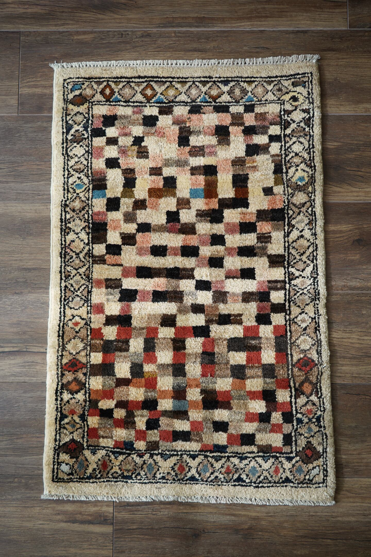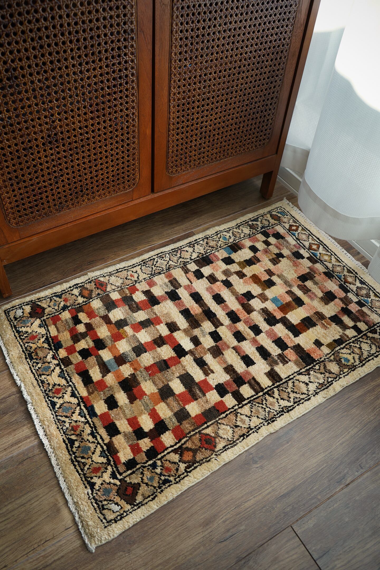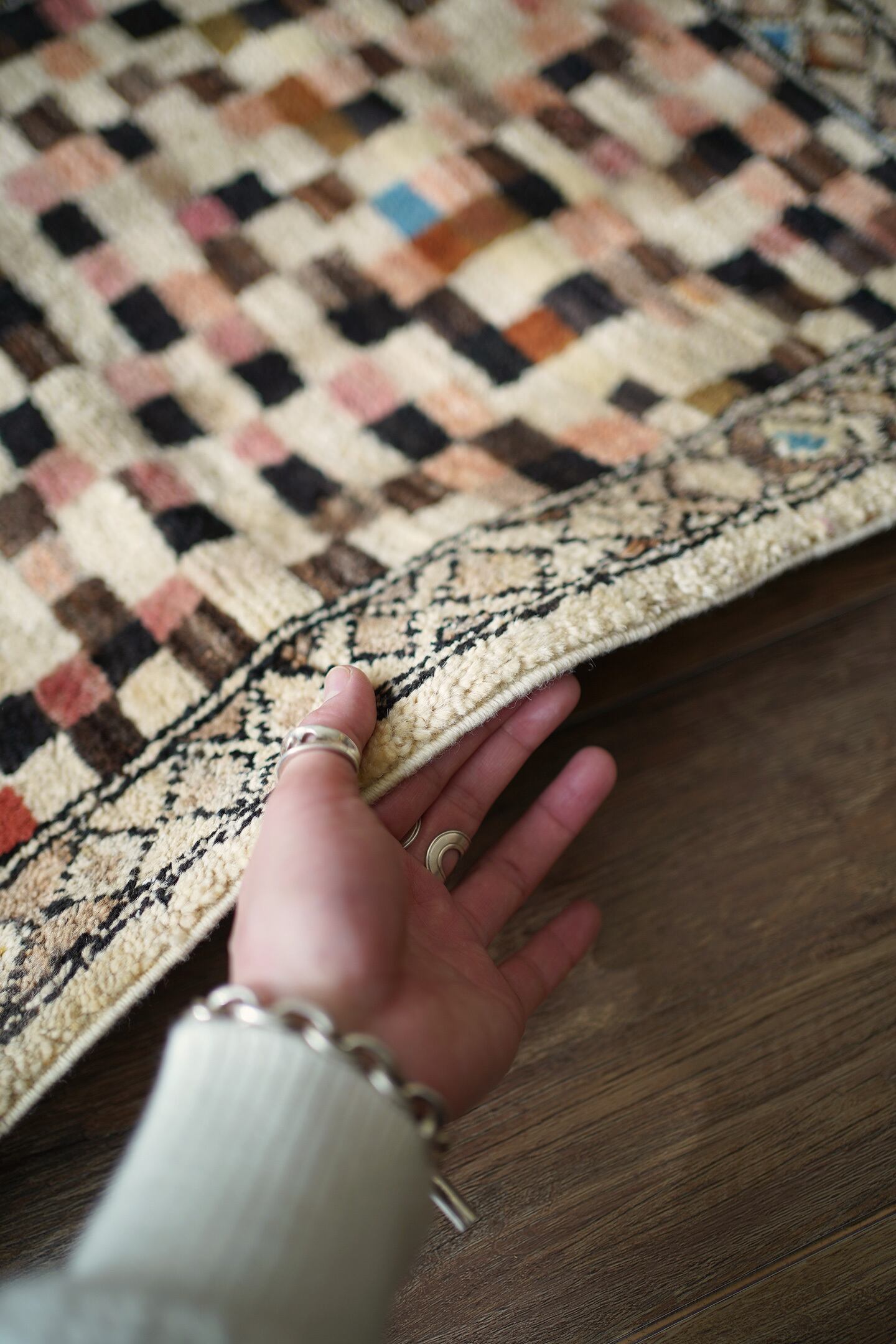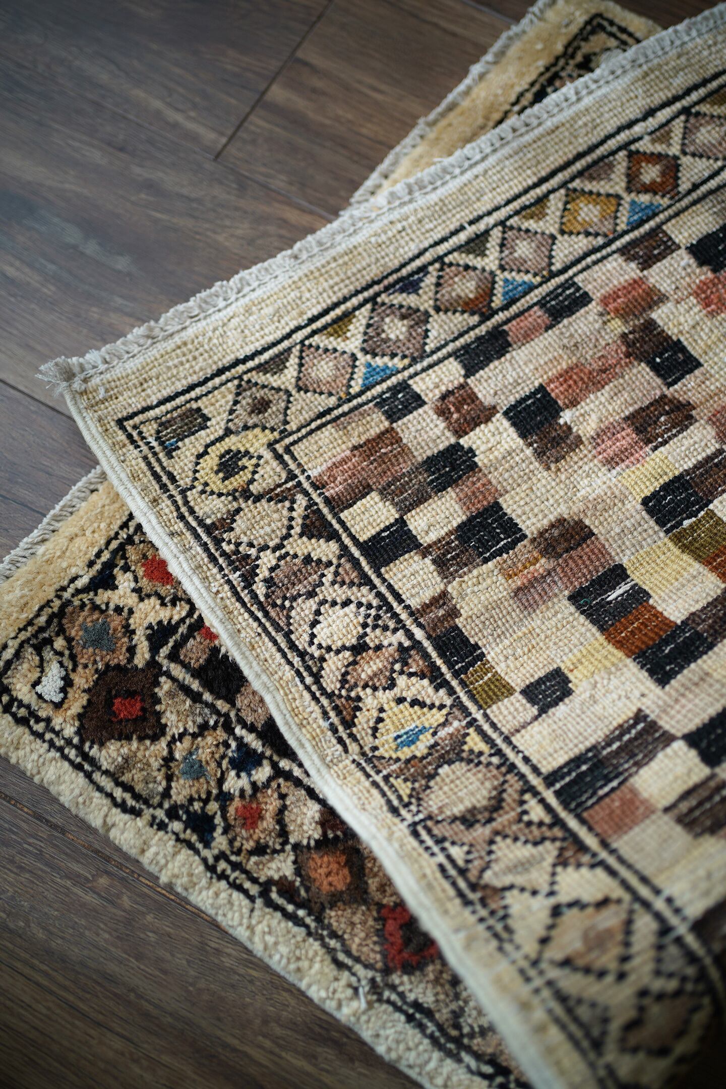 パキスタンとアフガニスタンの国境地域で作られた経年約10年〜15年のチョビラグ。モザイク調の珍しいデザインかつセンスのある配色に一目惚れして仕入れを決めた一枚です。モザイク部分は朱色から淡いピンクのグラデーションになっており、一部水色がアクセントカラーに使われているところが非常にユニークで可愛らしいです。表面はふわっと優しい肌触りで、厚みは1.1cm程度。裏面は張りのある質感で厚みもあるため、非常に頑丈な作りとなっています。ダメージも見受けられず大変良好なコンディション。なかなか見かけないデザインなので、ピンと来た方はお見逃しなく。