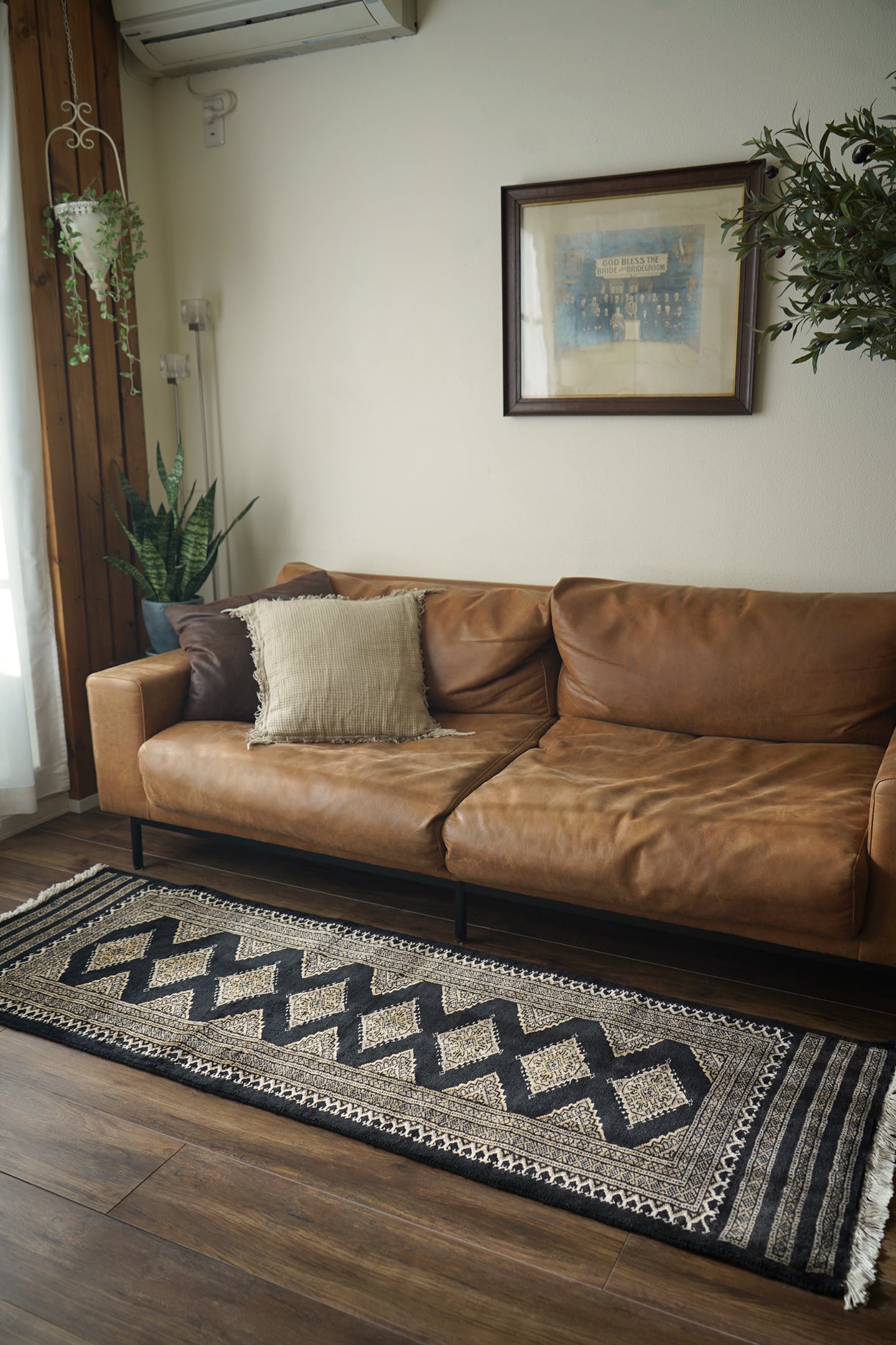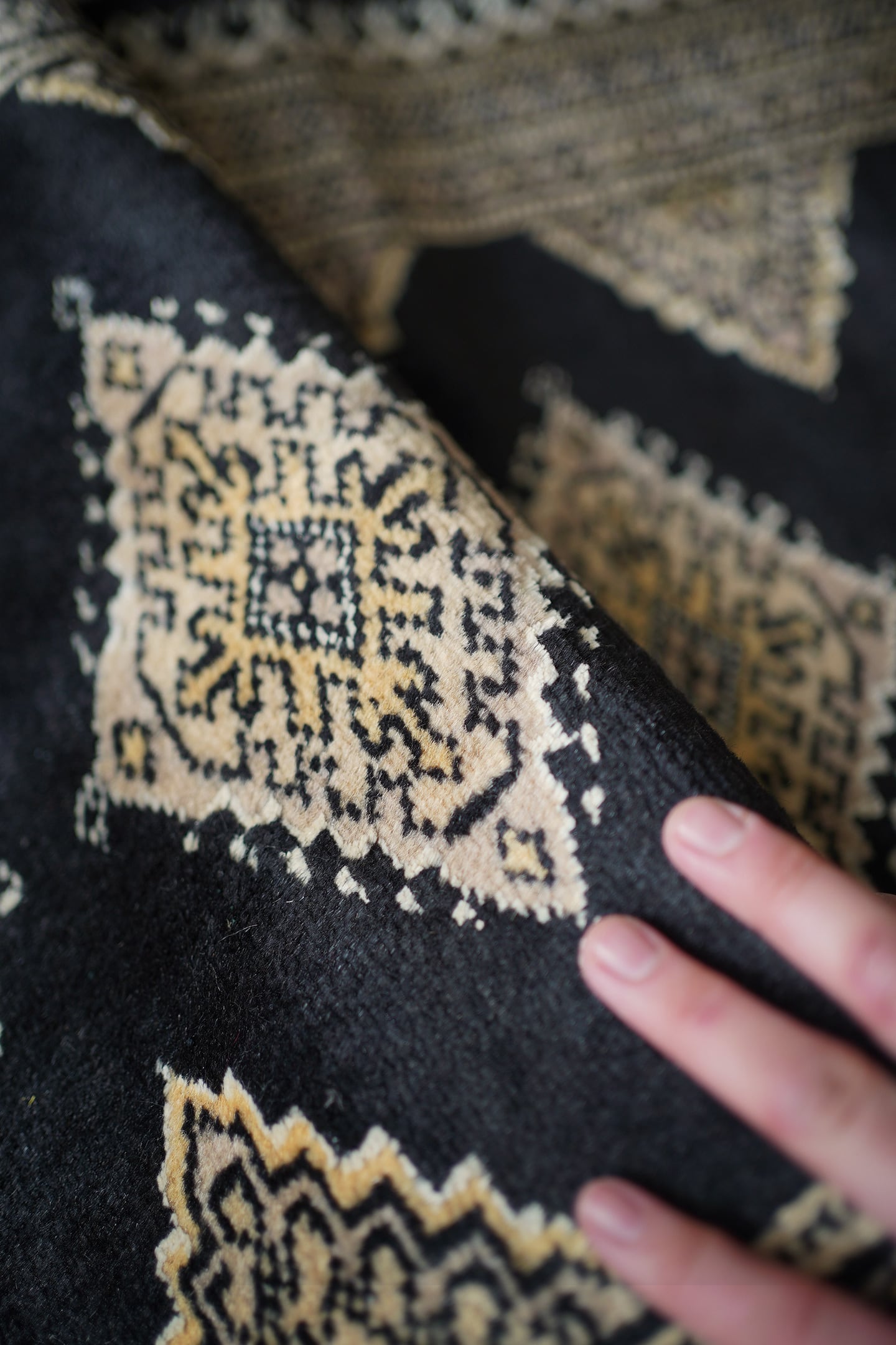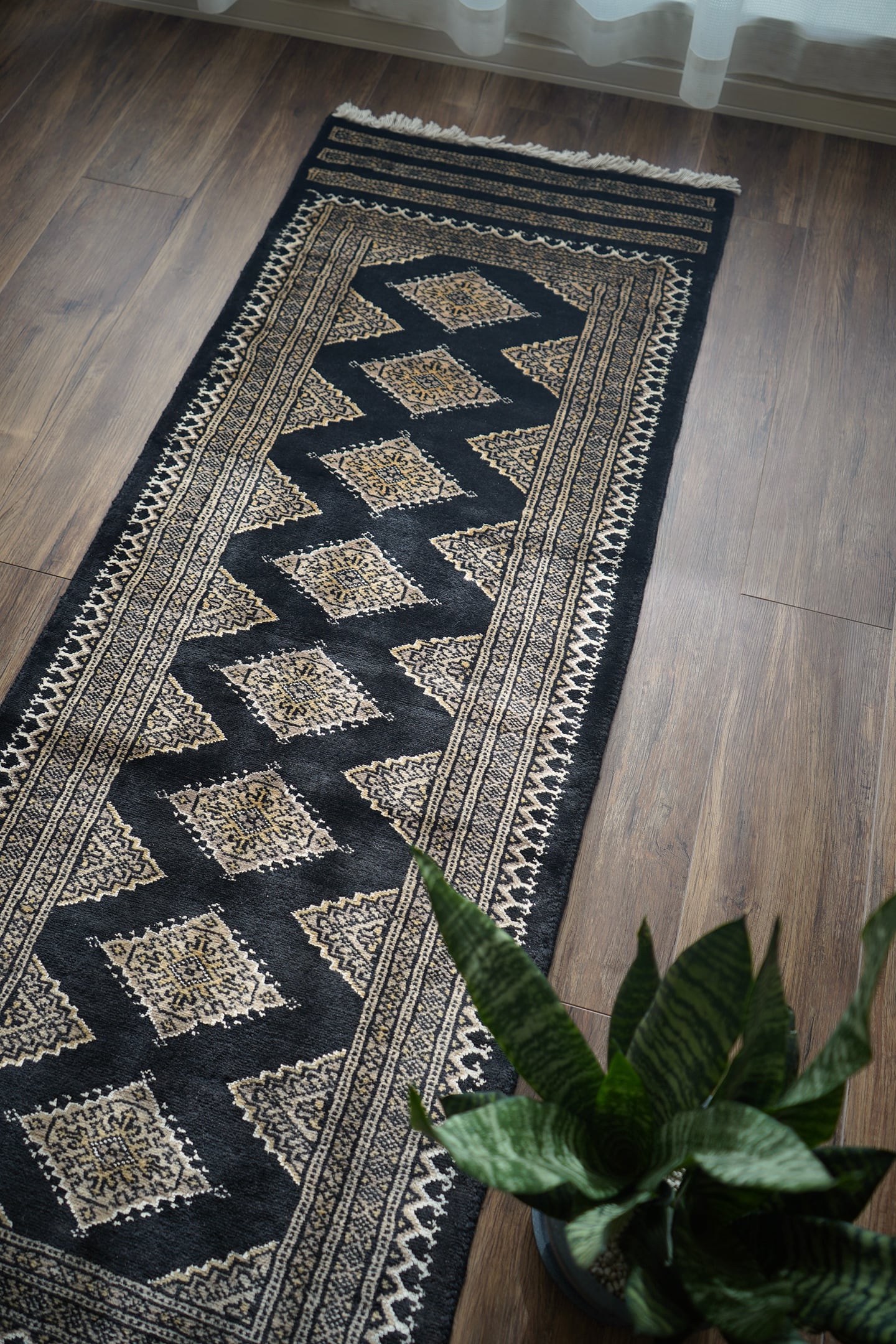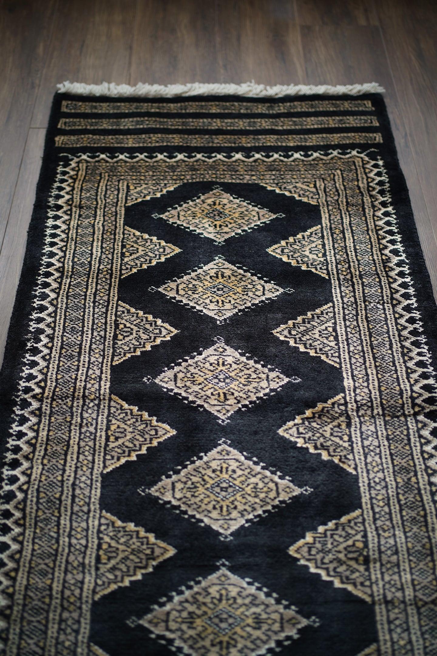 パキスタン北東部の都市ラホールで織られたヴィンテージラグ。パキスタンラグ特有の幾何学模様が織り込まれたデザインで、光沢感のある艶が美しい一枚。パキスタンラグでは珍しい黒色ベースの配色で、その他、ベージュ、オフホワイトなどが使われたシックでカッコいい雰囲気です。ふわっと柔らかく、優しいタッチの心地良い肌触りで、厚みは9mm程度。統一感のあるフラットな毛並みで非常に上質感があります。使用感もあまり見られず大変良好なコンディション。ランナータイプなので廊下やキッチンなどにどうぞ♫