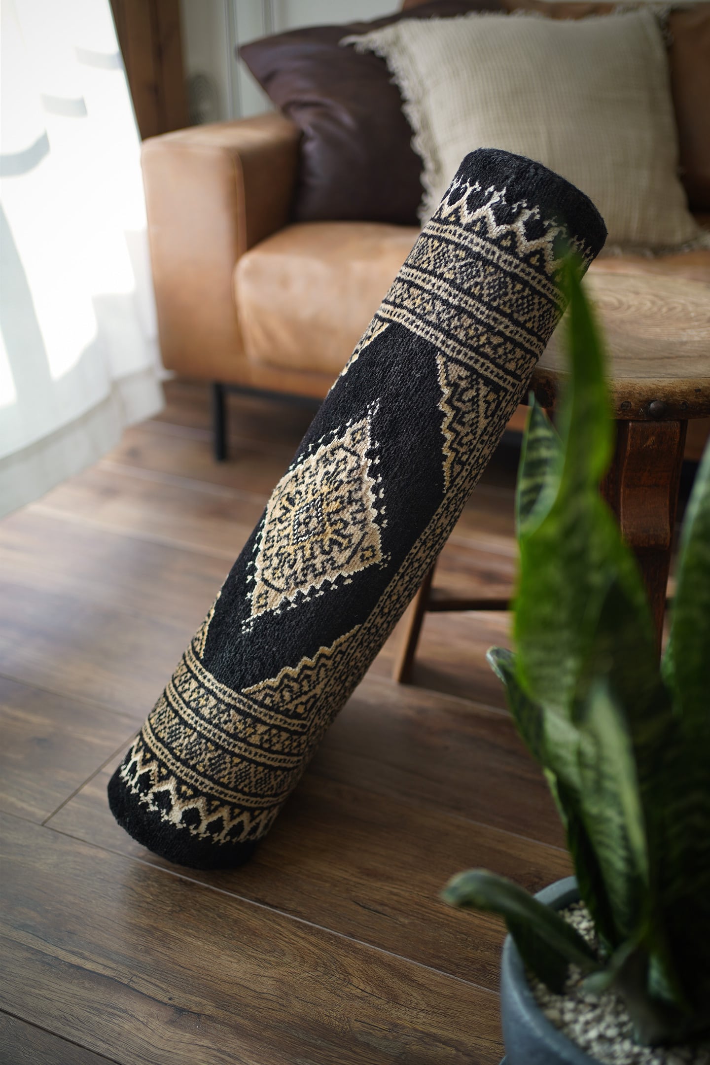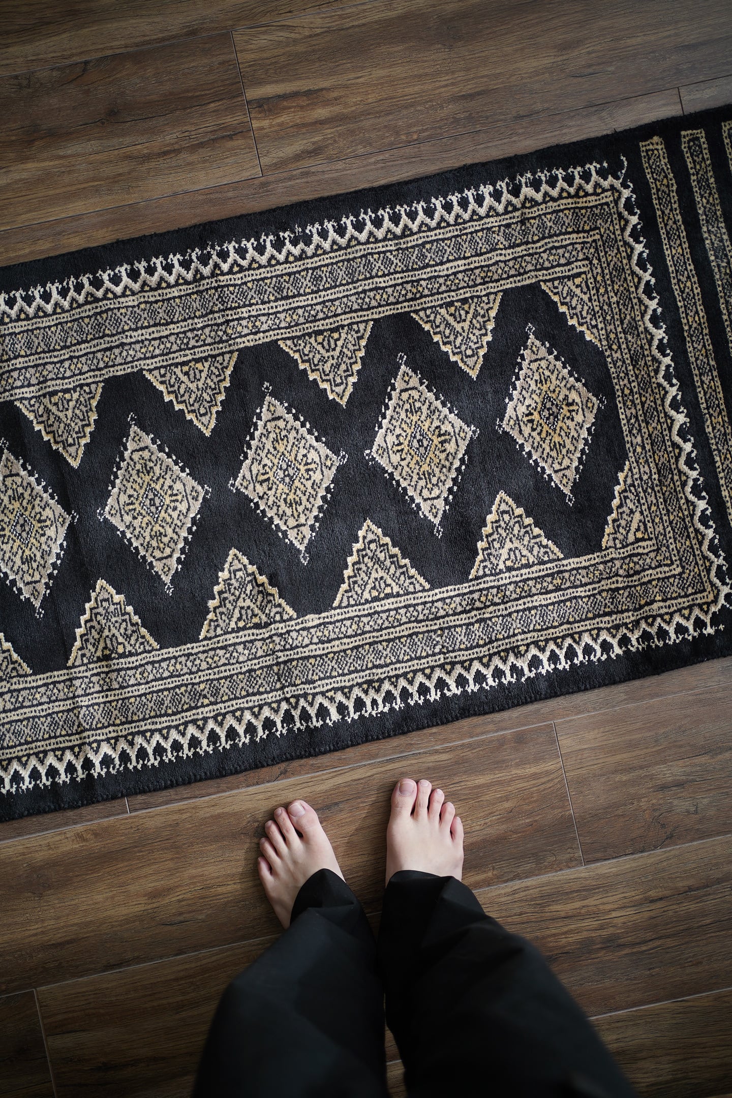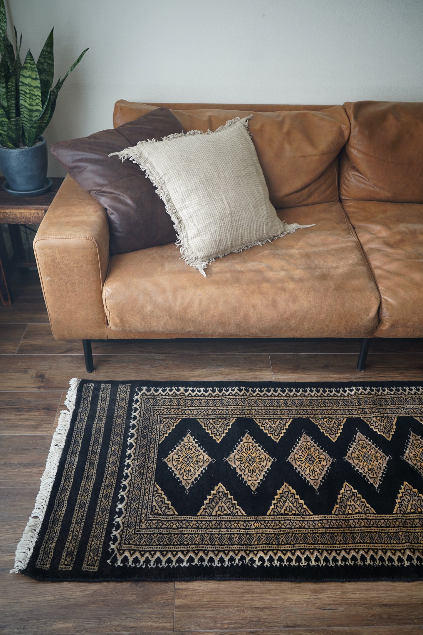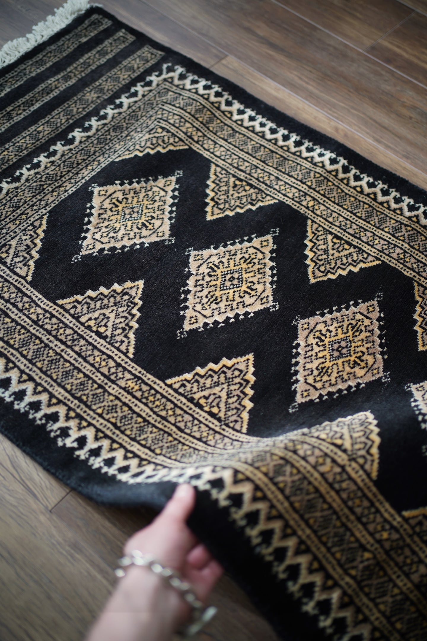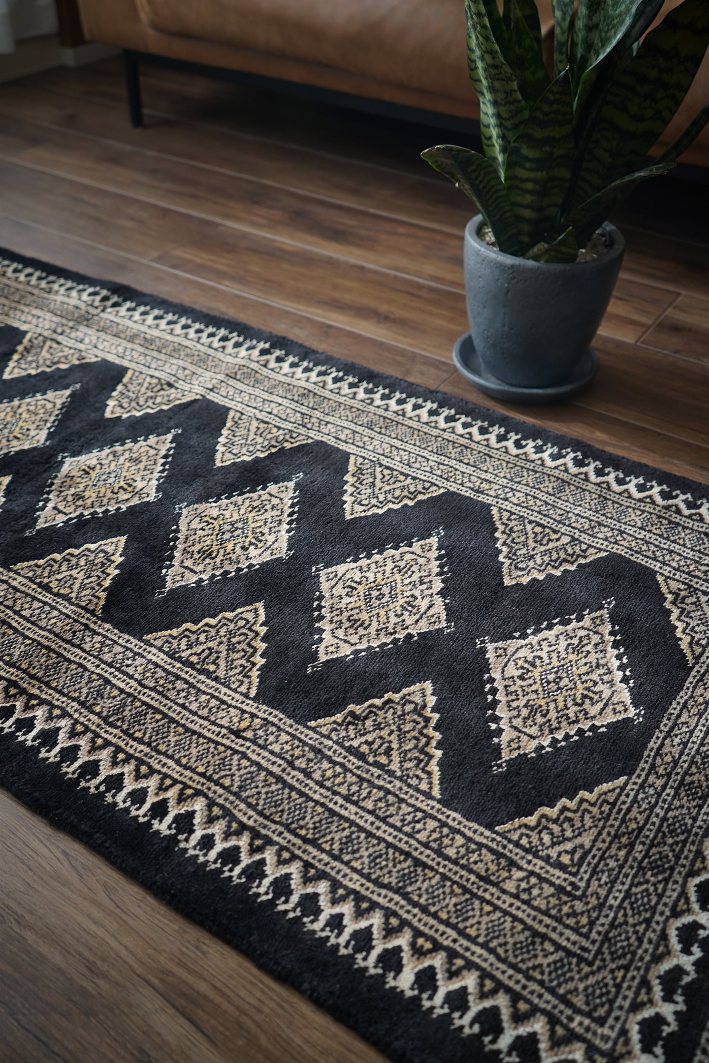 パキスタン北東部の都市ラホールで織られたヴィンテージラグ。パキスタンラグ特有の幾何学模様が織り込まれたデザインで、光沢感のある艶が美しい一枚。パキスタンラグでは珍しい黒色ベースの配色で、その他、ベージュ、オフホワイトなどが使われたシックでカッコいい雰囲気です。ふわっと柔らかく、優しいタッチの心地良い肌触りで、厚みは9mm程度。統一感のあるフラットな毛並みで非常に上質感があります。使用感もあまり見られず大変良好なコンディション。ランナータイプなので廊下やキッチンなどにどうぞ♫