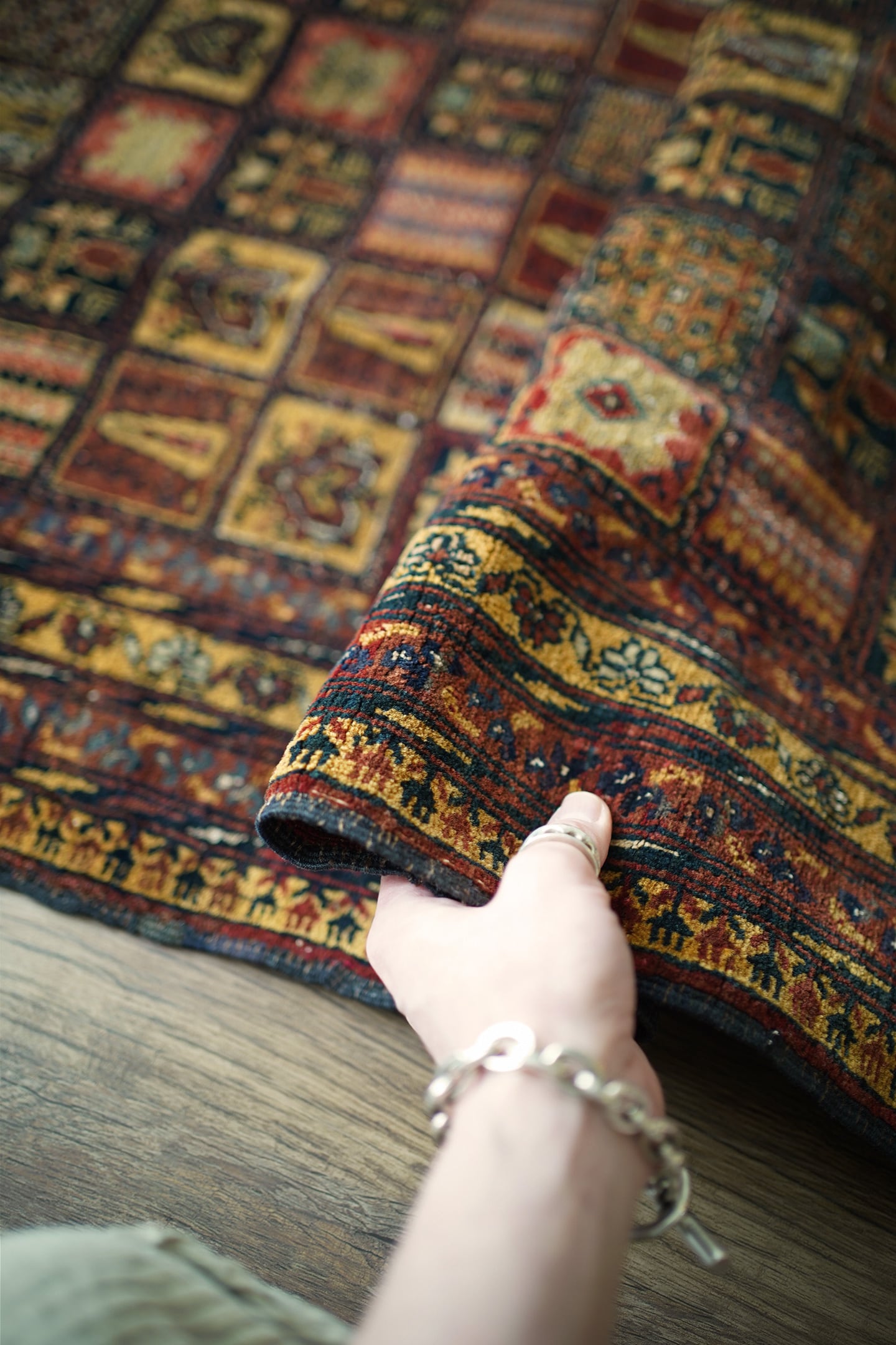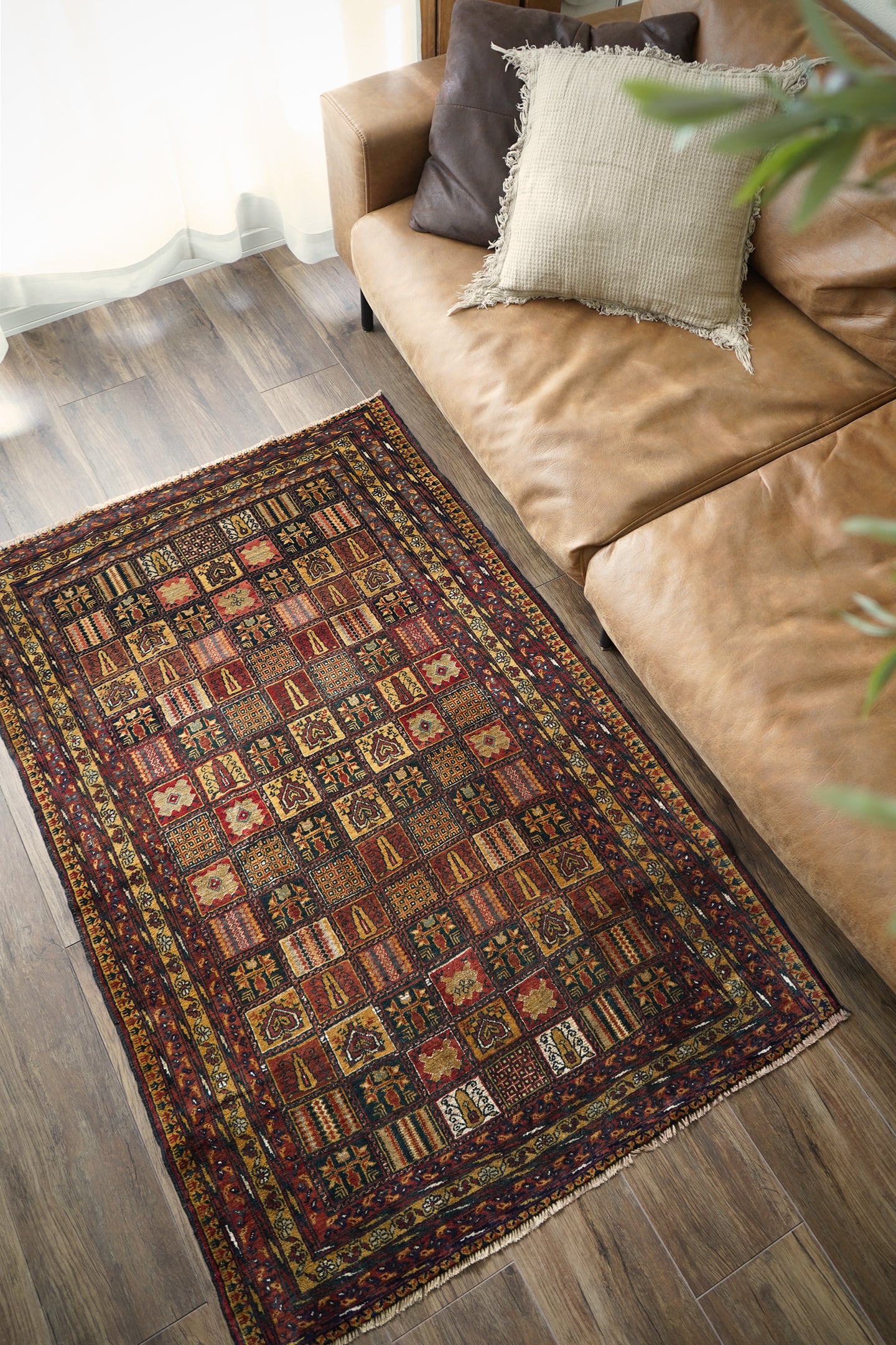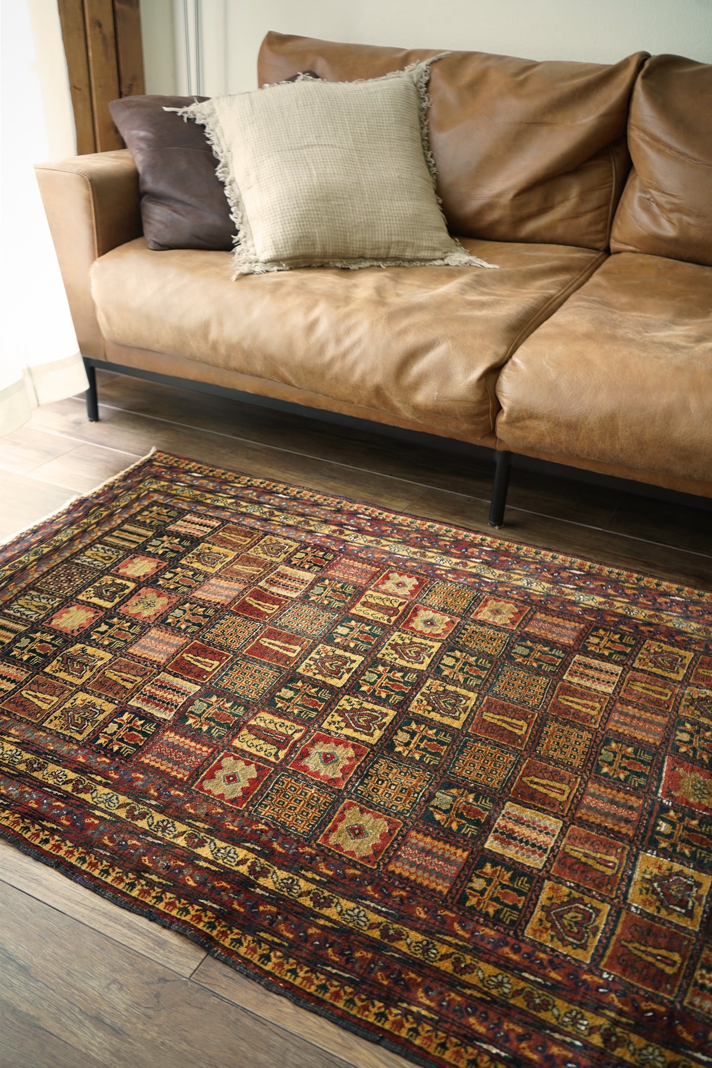 現地セラーも今まで見たことがないと言っていたほど、非常に稀少なデザインのアリホジャラグです。縦横に規則正しく区切られたパネル型には花紋様や幾何学模様などがアリホジャ特有の細かい織りで表現されており、非常に芸術性の高い一枚。配色はキャメル、赤茶、ブラック、オフホワイト、グレーなどで、一部白い部分はシルクが使われている大変珍しいタイプです。パイルは非常に短めですが、しっとり滑らかで心地の良い肌触りをしています。厚みは5mmほど、やや薄めですが程よく重みもあり、ずれる心配もあまりないかと思います。ダメージや補修された跡も見受けられずパーフェクトなコンディション。滅多に出会えない圧巻のコレクターズピース、あなたの宝物になりましたら嬉しいです。