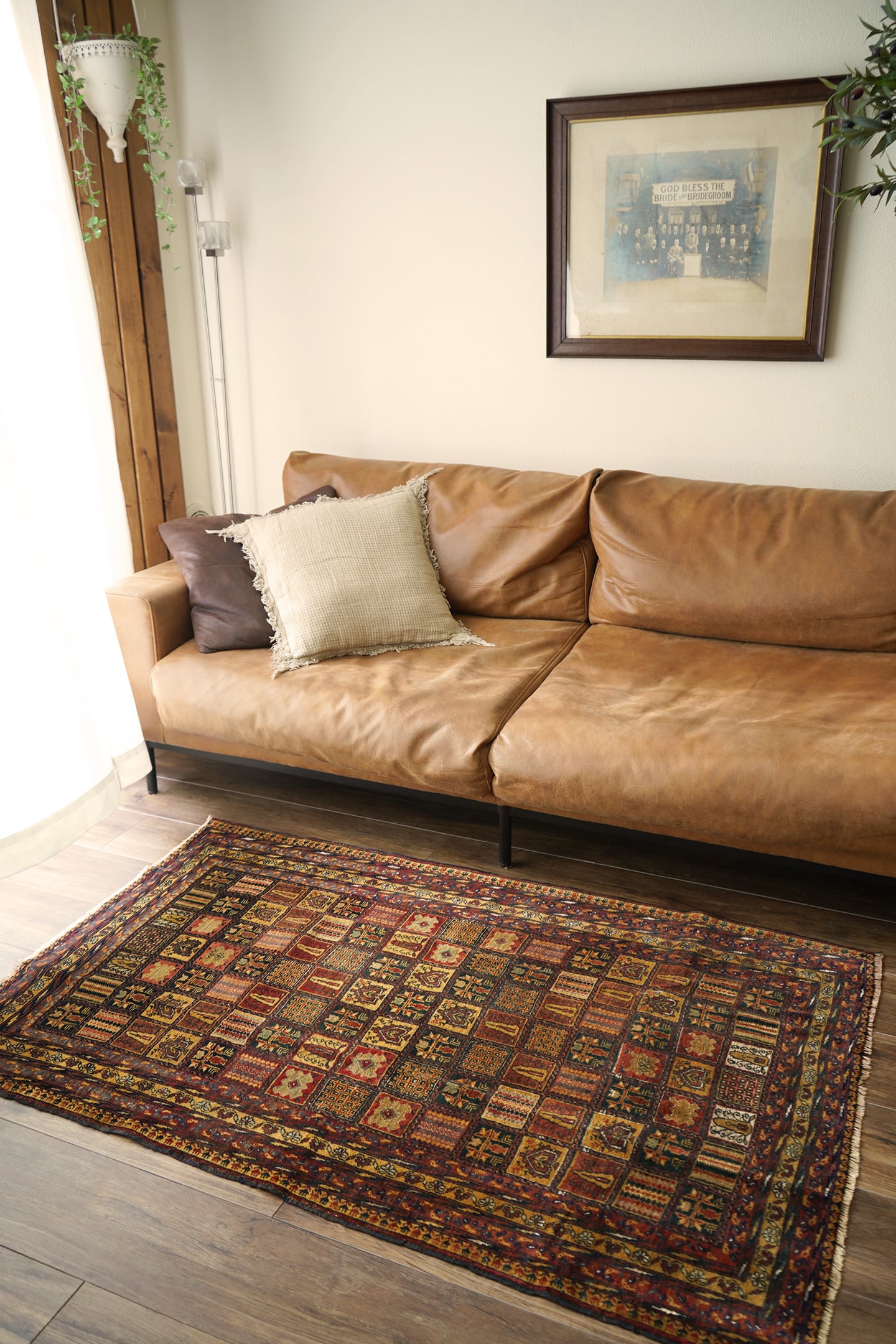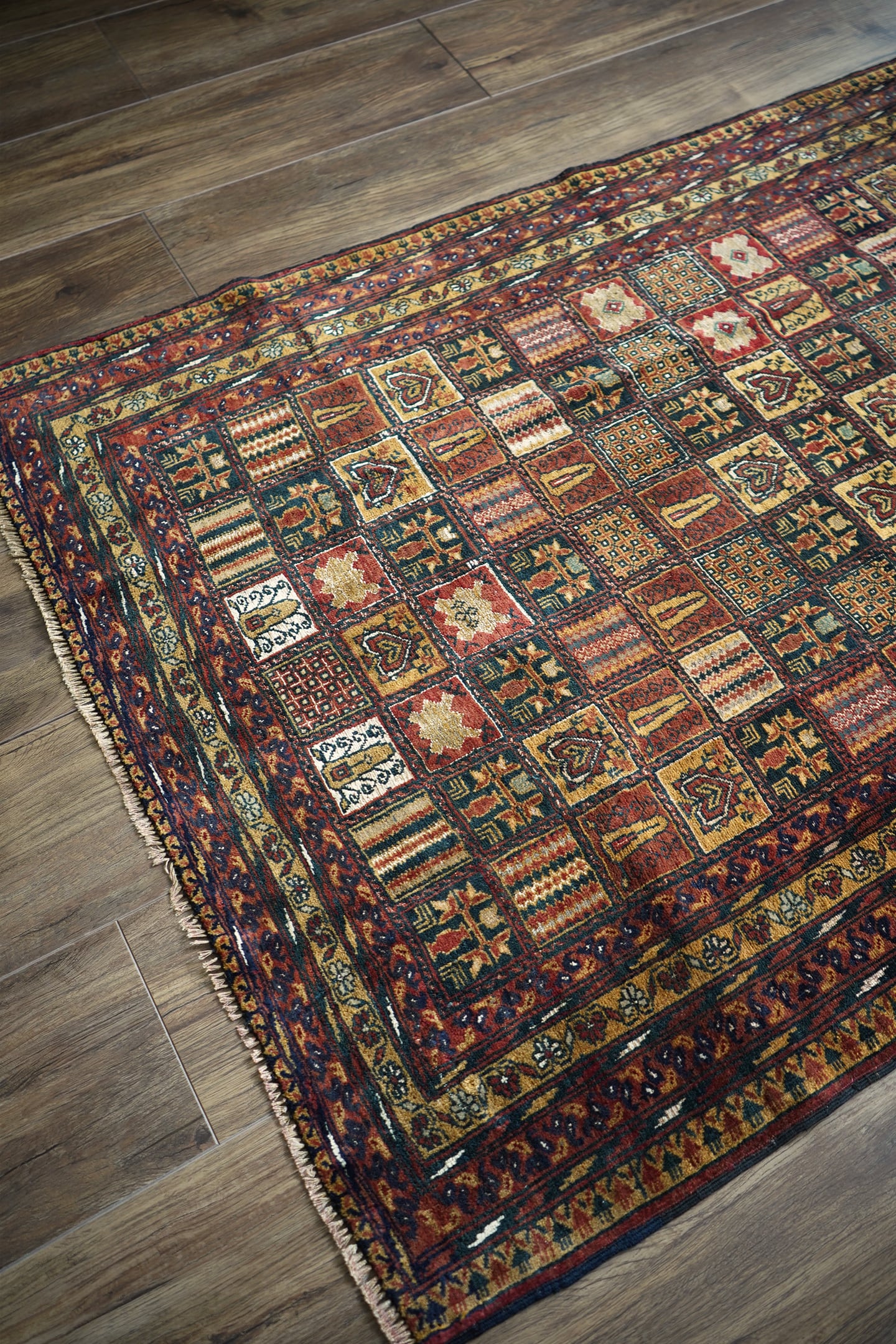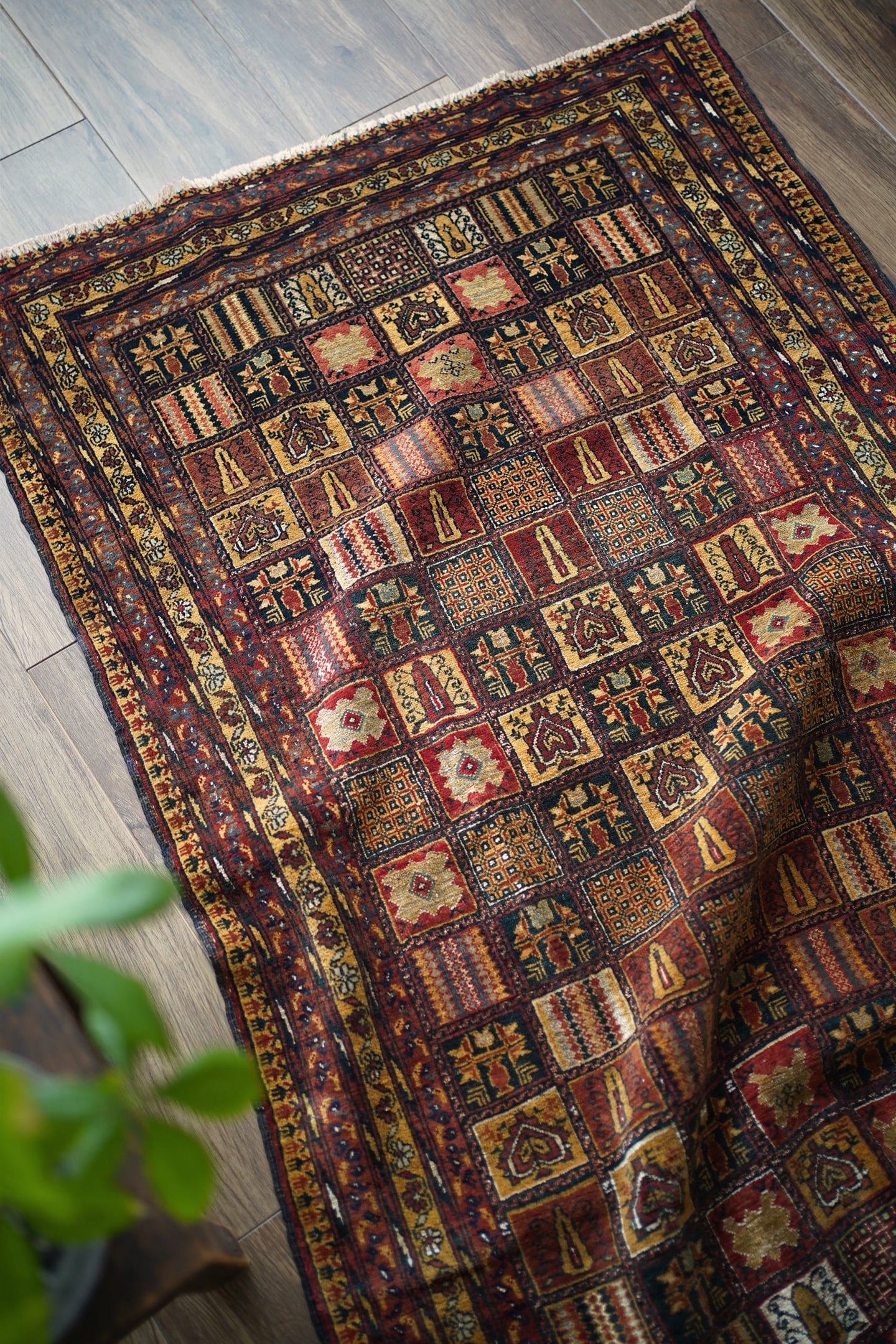 現地セラーも今まで見たことがないと言っていたほど、非常に稀少なデザインのアリホジャラグです。縦横に規則正しく区切られたパネル型には花紋様や幾何学模様などがアリホジャ特有の細かい織りで表現されており、非常に芸術性の高い一枚。配色はキャメル、赤茶、ブラック、オフホワイト、グレーなどで、一部白い部分はシルクが使われている大変珍しいタイプです。パイルは非常に短めですが、しっとり滑らかで心地の良い肌触りをしています。厚みは5mmほど、やや薄めですが程よく重みもあり、ずれる心配もあまりないかと思います。ダメージや補修された跡も見受けられずパーフェクトなコンディション。滅多に出会えない圧巻のコレクターズピース、あなたの宝物になりましたら嬉しいです。