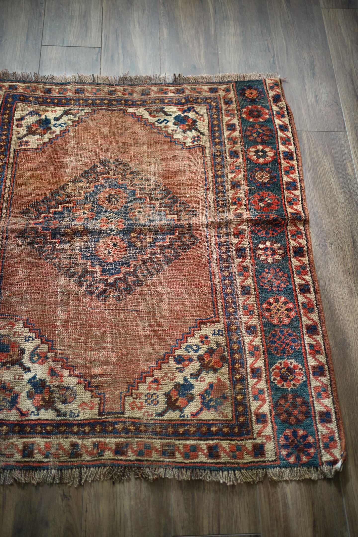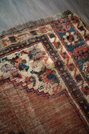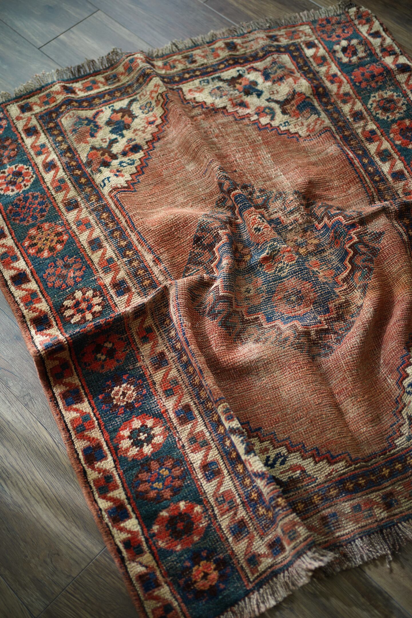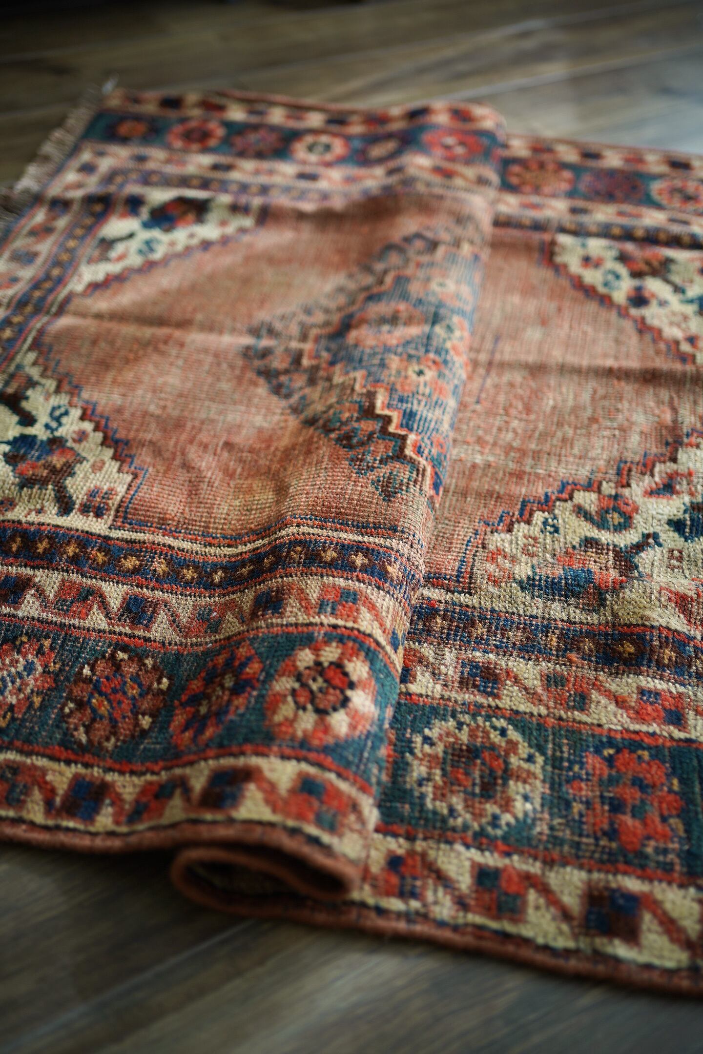 おおよそ100年前にイラン南西部に居住するカシュガイ族によって織られたラグです。強い摩擦がある古びた風合いが魅力的な一枚で、中央に大きなフックドメダリオンが織り込まれたデザイン。くすんだサーモンピンクのような色味が特徴的で、その他ブルーグリーン、ベージュ、ネイビー、ブラウンなどが使われた配色です。経年によりパイルはほとんど残っておらず、サラサラと乾いた肌触りをしており、厚みは4mm〜5mm程度。クタッとペラっとした質感のラグです。光にかざして裏面から透かしてみると、薄くなっている部分が多くありますが穴は見受けられません。またシラゼ部分(フレーム)にほつれがありますのでお写真最後にてご確認ください(追加費用にて修理も可能ですが、全体的に古さを感じるラグですので、味わいとしてこのままお使いいただくのもよろしいかと思います)。歴史を感じる素敵な一枚、アンティークとしての状態にご理解いただける方にお迎えいただけましたら幸いです。