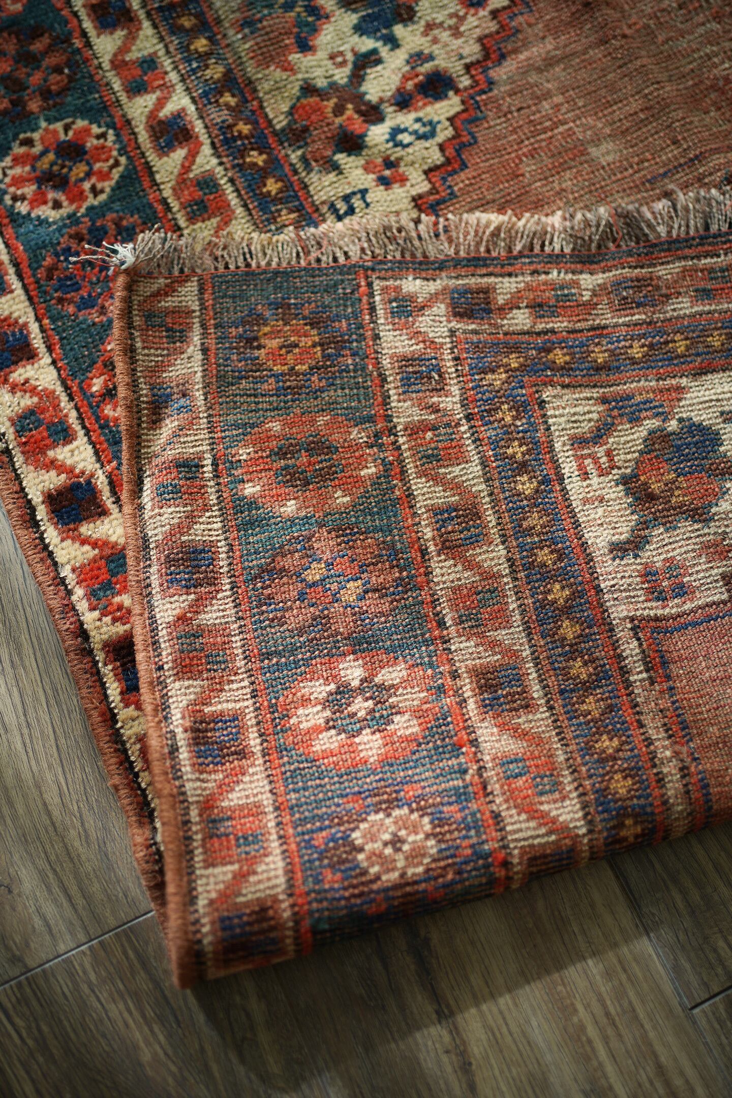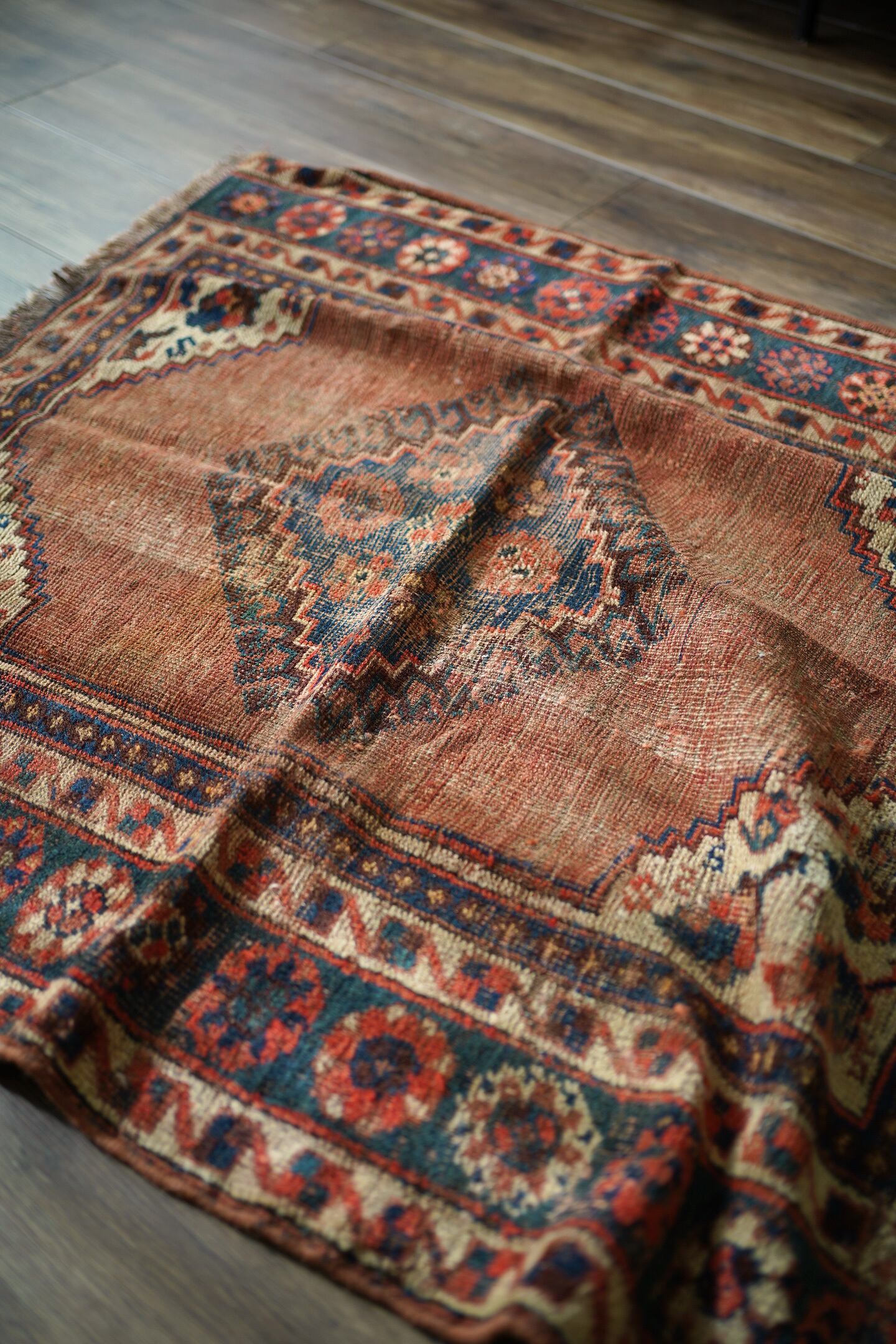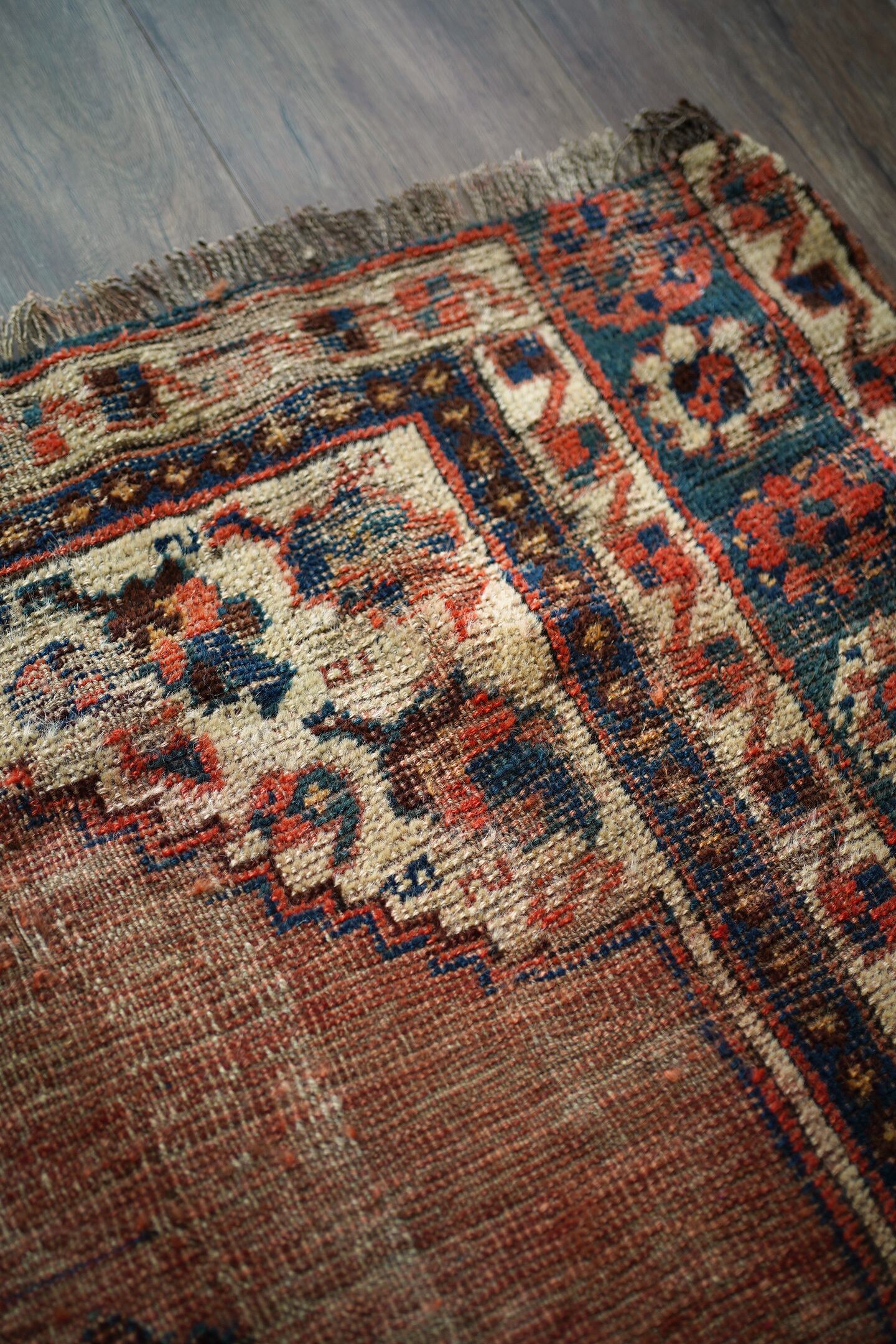 おおよそ100年前にイラン南西部に居住するカシュガイ族によって織られたラグです。強い摩擦がある古びた風合いが魅力的な一枚で、中央に大きなフックドメダリオンが織り込まれたデザイン。くすんだサーモンピンクのような色味が特徴的で、その他ブルーグリーン、ベージュ、ネイビー、ブラウンなどが使われた配色です。経年によりパイルはほとんど残っておらず、サラサラと乾いた肌触りをしており、厚みは4mm〜5mm程度。クタッとペラっとした質感のラグです。光にかざして裏面から透かしてみると、薄くなっている部分が多くありますが穴は見受けられません。またシラゼ部分(フレーム)にほつれがありますのでお写真最後にてご確認ください(追加費用にて修理も可能ですが、全体的に古さを感じるラグですので、味わいとしてこのままお使いいただくのもよろしいかと思います)。歴史を感じる素敵な一枚、アンティークとしての状態にご理解いただける方にお迎えいただけましたら幸いです。