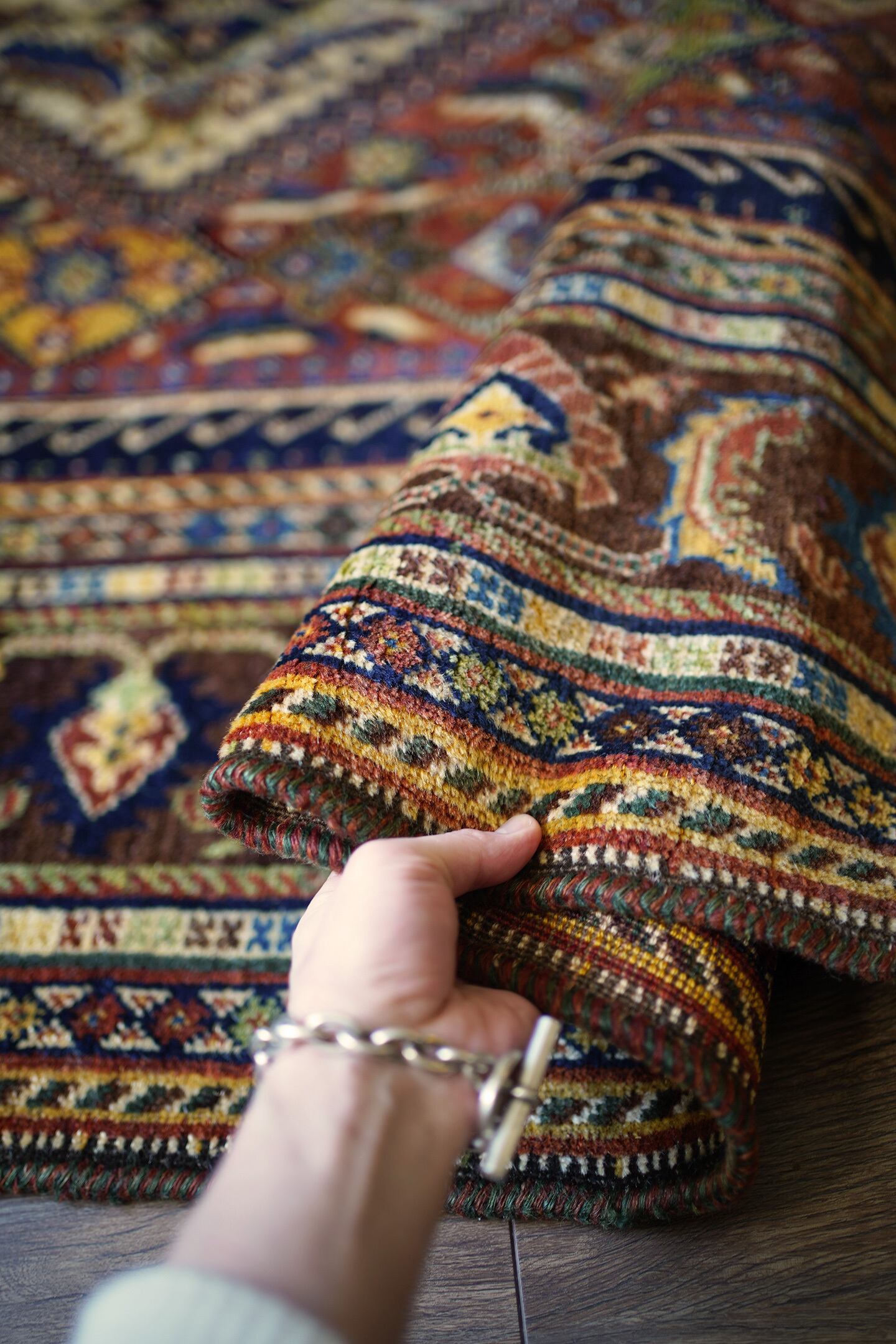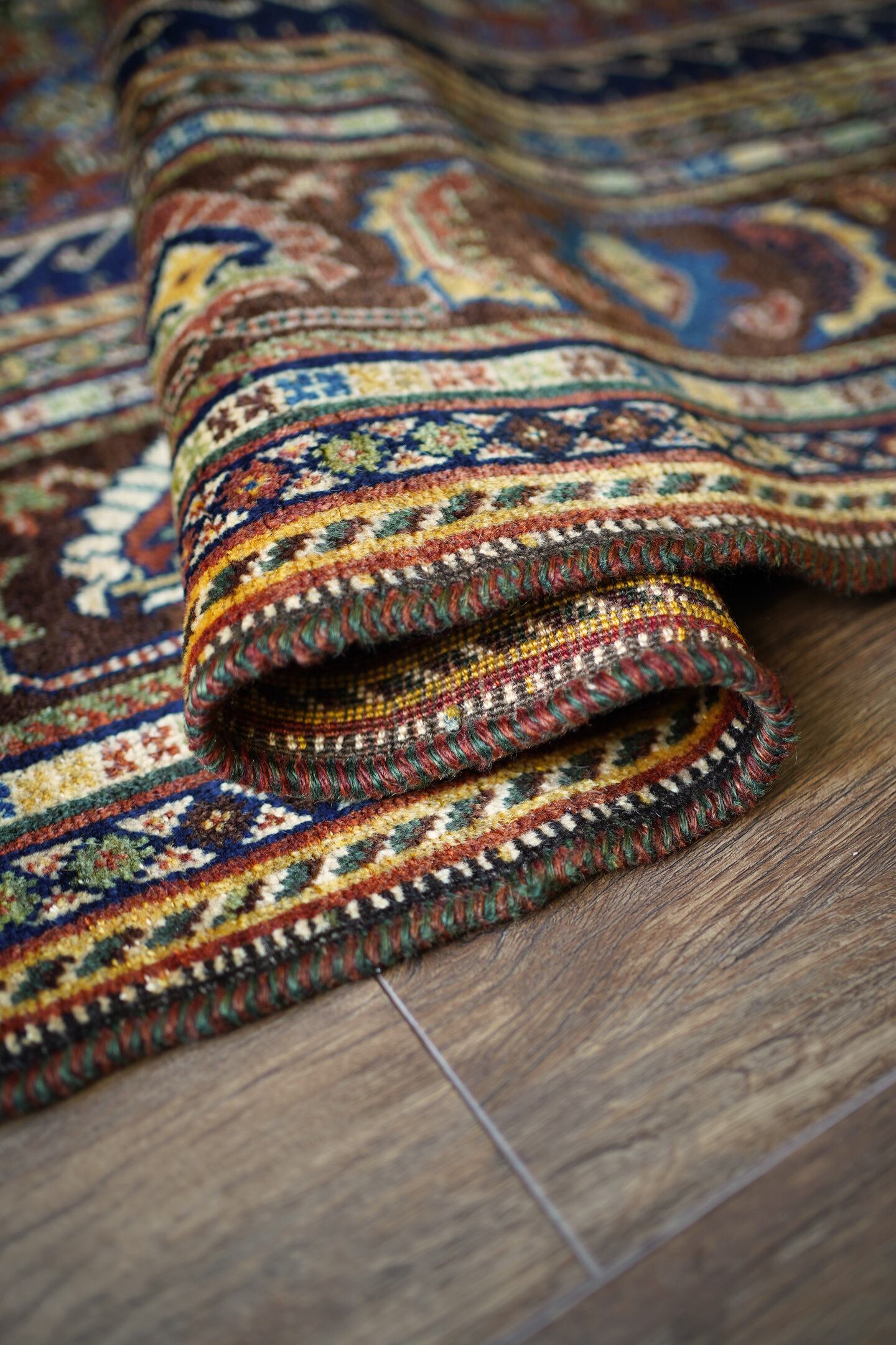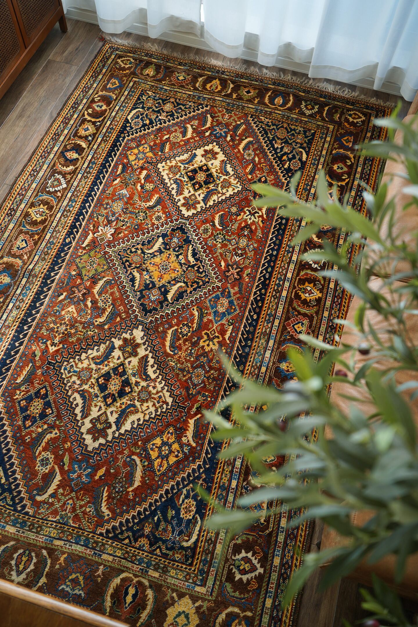 三連のフックドメダリオンとフィールドには羽や葉っぱを連想させる繊細な紋様の数々が所狭しと散りばめられており、ラグ全体から生き生きとした"力強さ"と"エネルギッシュさ"を感じさせます。ボーダーには花の断面図であるパルメット紋様が様々な配色で美しく織り込まれています。